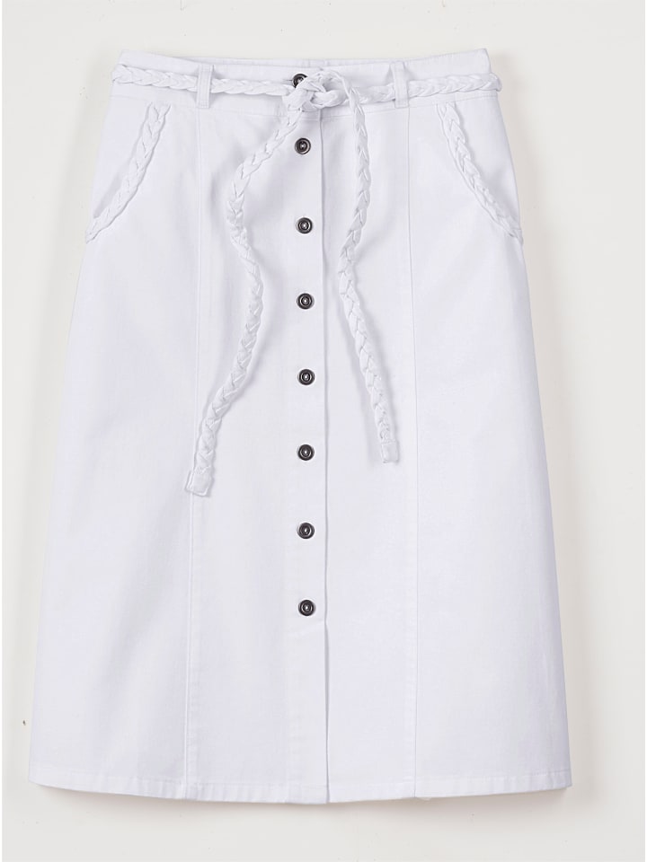Юбка на пуговицах из джинсовой ткани со шлевками и плетеным поясом. Два кармана украшены узором «косички». Спереди разрез для свободы движений.