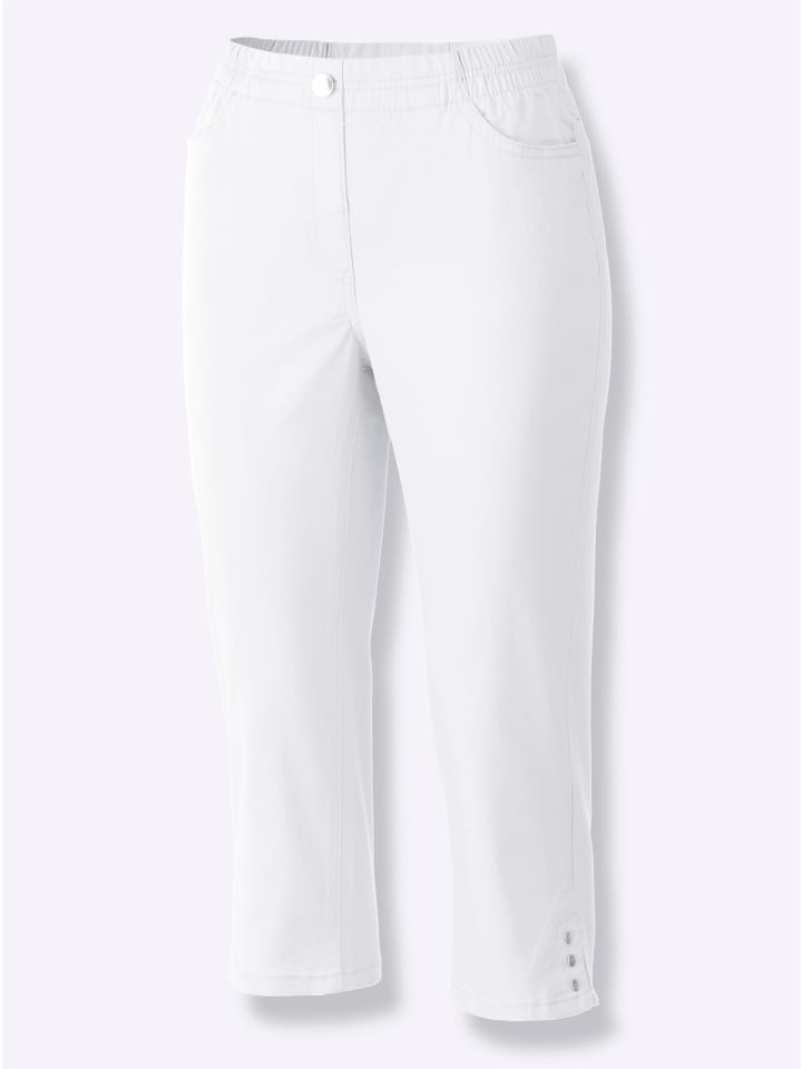 Наш летний фаворит: невероятно удобные джинсы-капри с поясом на резинке по всему периметру и кокеткой сзади. Разрезы на штанинах украшены заклепками. Особенности: имитация пуговицы и молнии, два передних и два задних кармана. Длина штанины примерно 41 см.