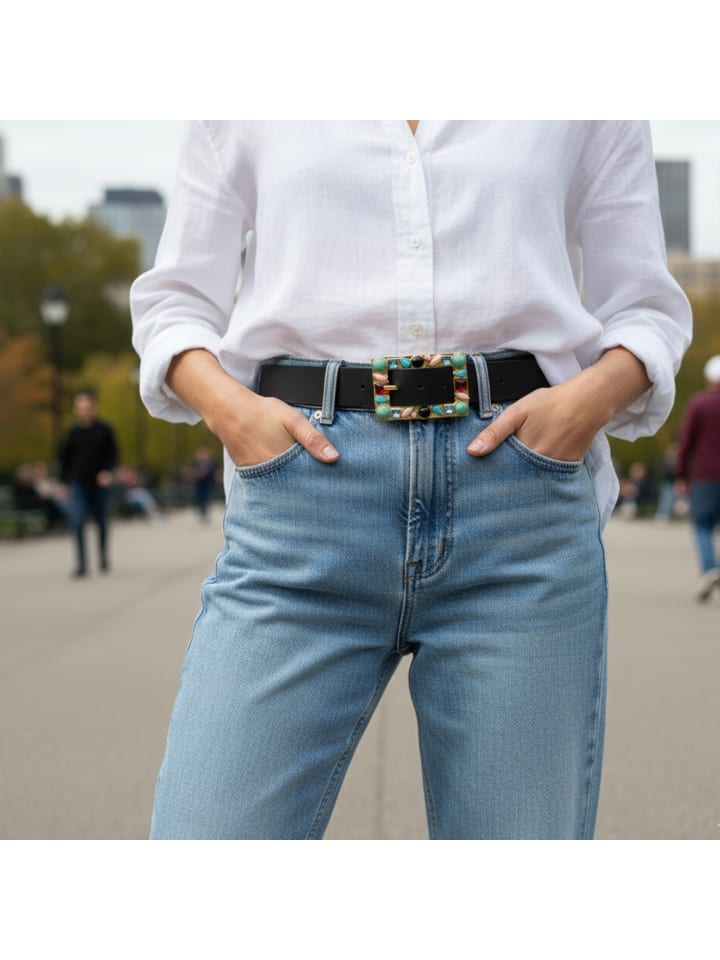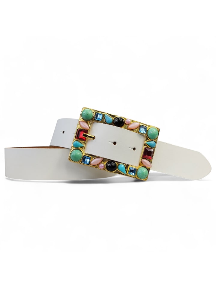 Женский ремень с большой декоративной пряжкой. Этот привлекательный женский ремень мгновенно вызывает летние чувства. Прямоугольная золотая пряжка украшена разноцветными камнями. Разноцветные ремешки из натуральной коровьей кожи идеально дополняют его. Настоящая приманка для глаз в сочетании с платьями или брюками, подобранными по цвету к ремню.