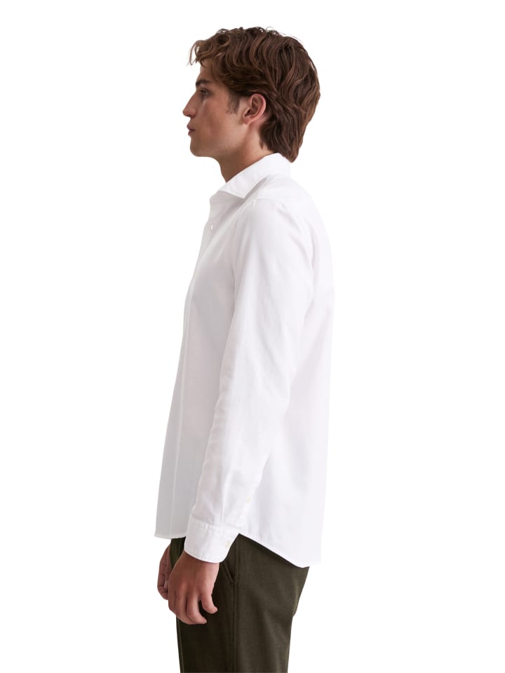 Современная рубашка приталенного кроя из прочного органического хлопка с тонким саржевым переплетением, придающим ткани легкую диагональную текстуру. Воротник-стойка, застежка на пуговицы по всей длине и манжеты на двух пуговицах позволяют создавать разнообразные образы, а закругленный подол обеспечивает гибкость. Мягкая, приятная для кожи и прочная - идеально подходит для повседневной носки и неформальных случаев.