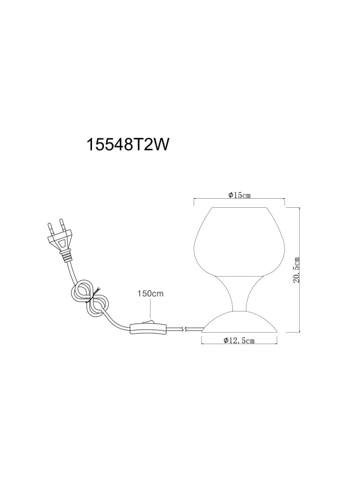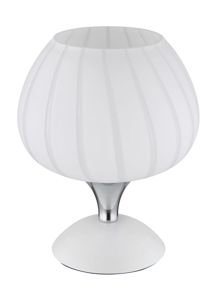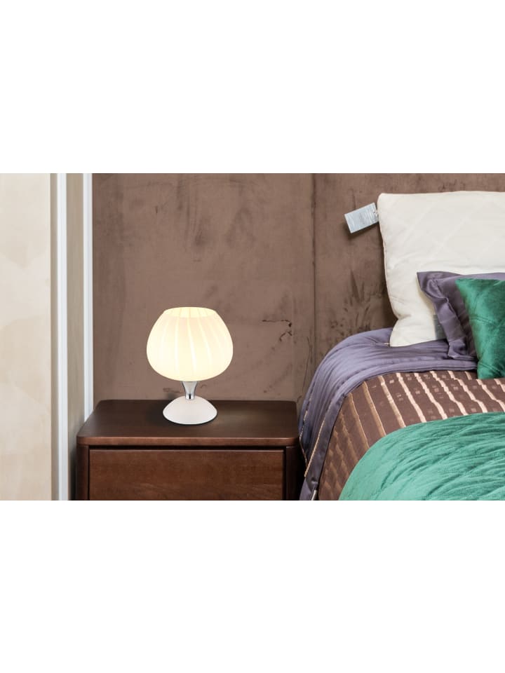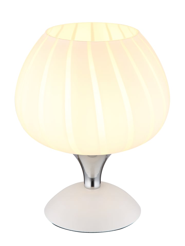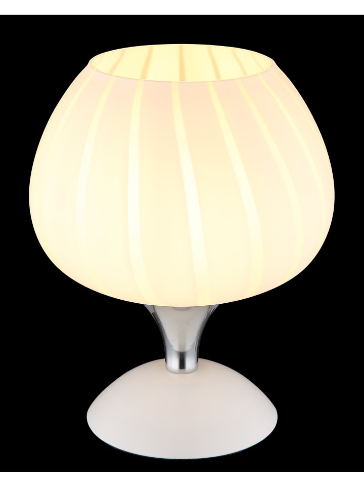 Настольная лампа, матовый белый металл, хромированный металл, опаловое сатинированное стекло, белый текстильный провод, клавишный выключатель на проводе, стекло с декоративными канавками, ø: 150 мм, H: 205 мм, длина провода 1500 мм, без 1 цоколя E27 40 Вт 230 В