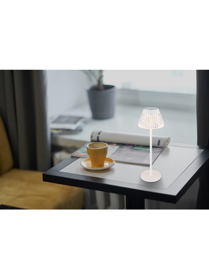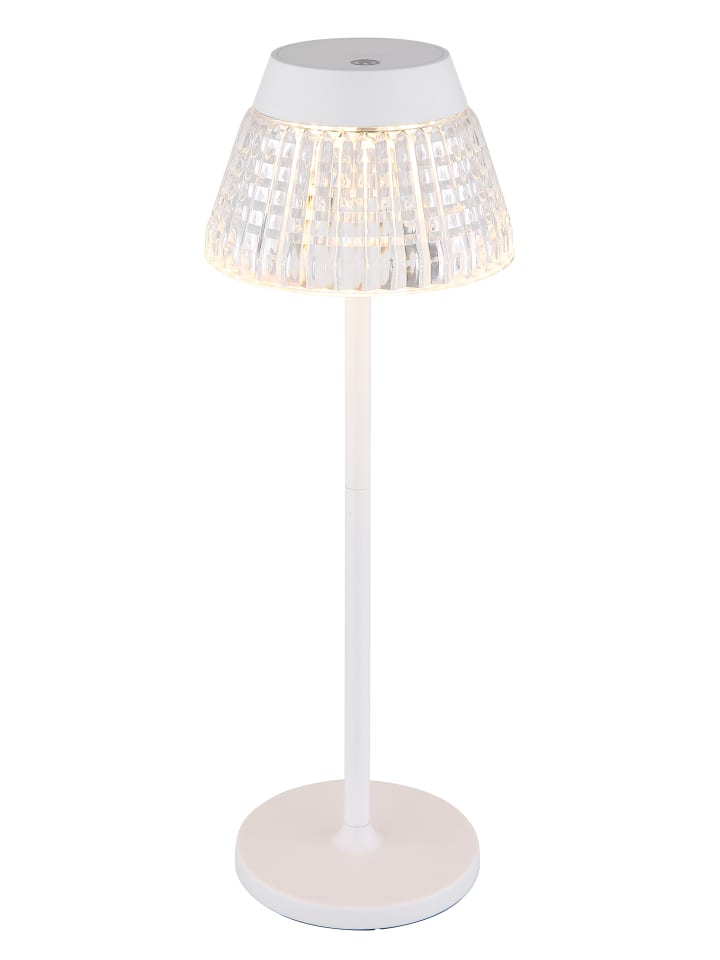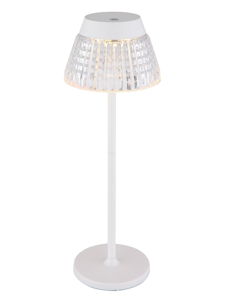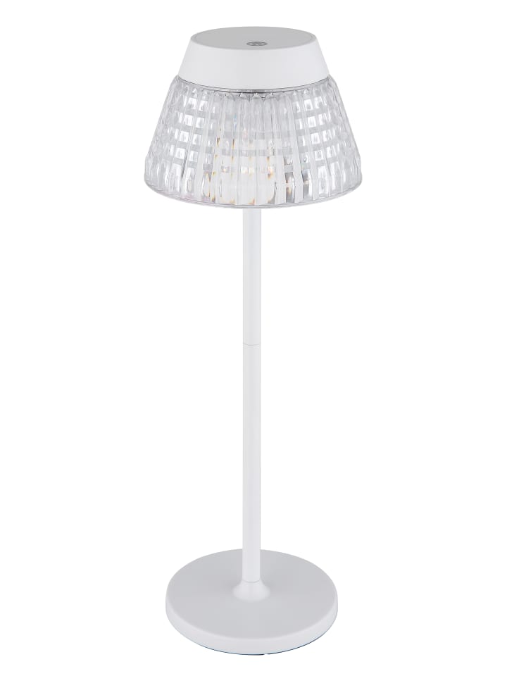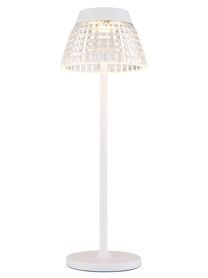 Настольная лампа, матовый белый металл, прозрачные акриловые кристаллы, матовый белый пластик, белый кабель из ПВХ, сенсорное включение/выключение, плавная регулировка яркости, USB-A 2.0 - USB-C, в комплекте аккумулятор CR18650 1200 мАч 3,7 В, время зарядки около 4 часов, время работы около 6 часов, диаметр: 135 мм, высота: 380 мм, длина кабеля 1000 мм, возможны 2 высоты: 21,5 см или 38 см, в комплекте светодиод 1 Вт 230 В, источник света 100 лм, световой поток 80 лм, цветовая температура 3000 К