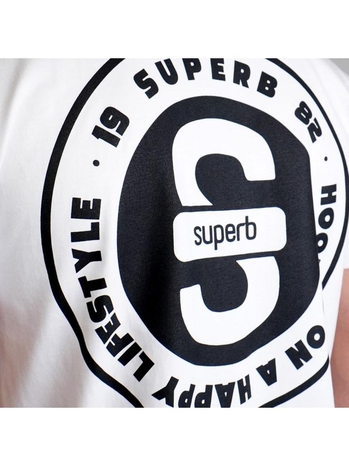 - Круглый принт с надписью «Hooked on a Happy Lifestyle» и логотипом Superb на спине.