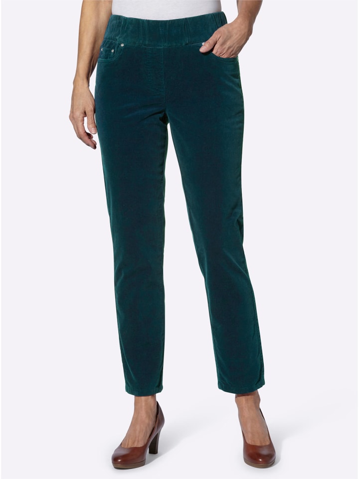 Модные и приятно теплые: эти брюки из бархата невероятно удобны и благодаря облегающему крою создают привлекательный силуэт. Они имеют 5-карманный фасон с внутренней резинкой на поясе и имитацией молнии. Сзади приталенная кокетка. Длина брючины примерно 34 см. Сертифицировано OCS, изготовлено из органического хлопка.