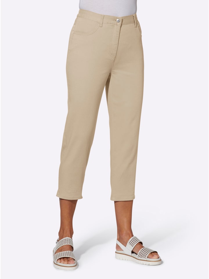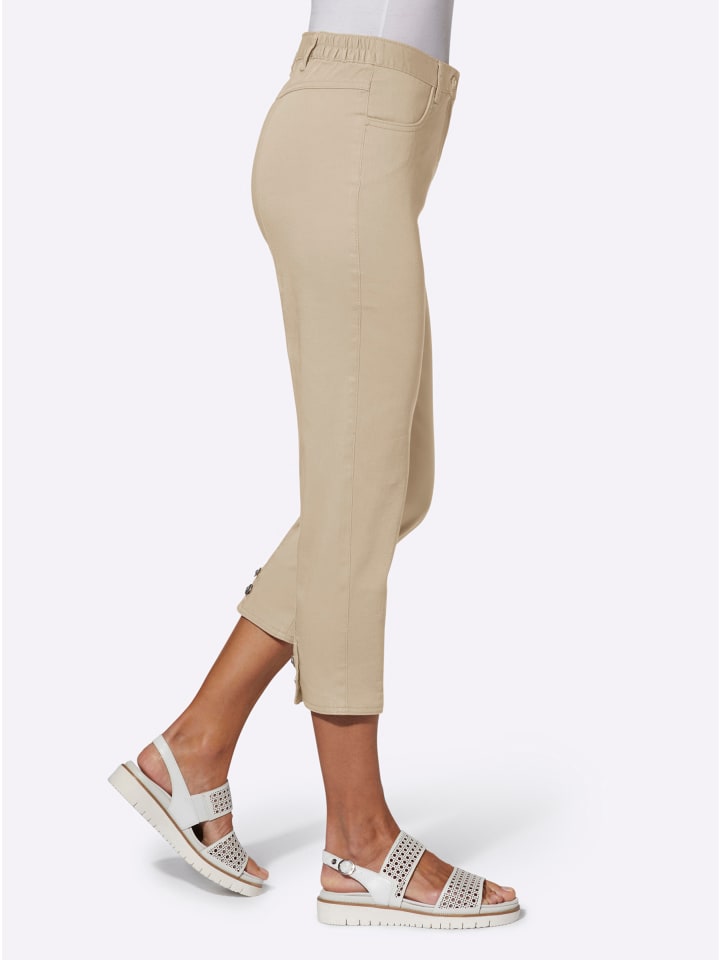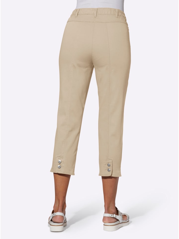 Брюки 7/8 с поясом на резинке по бокам. Удлиненные швы штанин и закругленные разрезы с 2 декоративными пуговицами. Застежка на пуговицы и молнию спереди, шлевки для ремня.