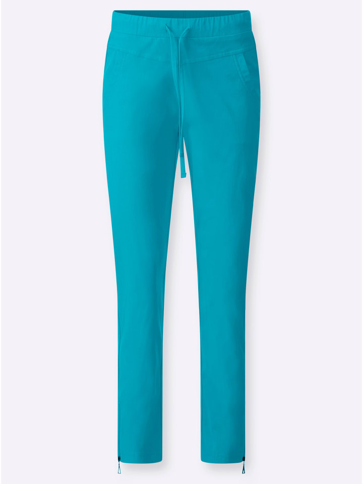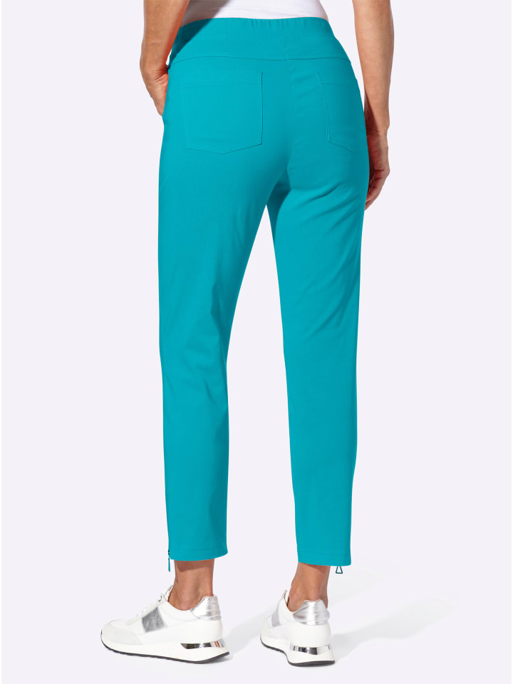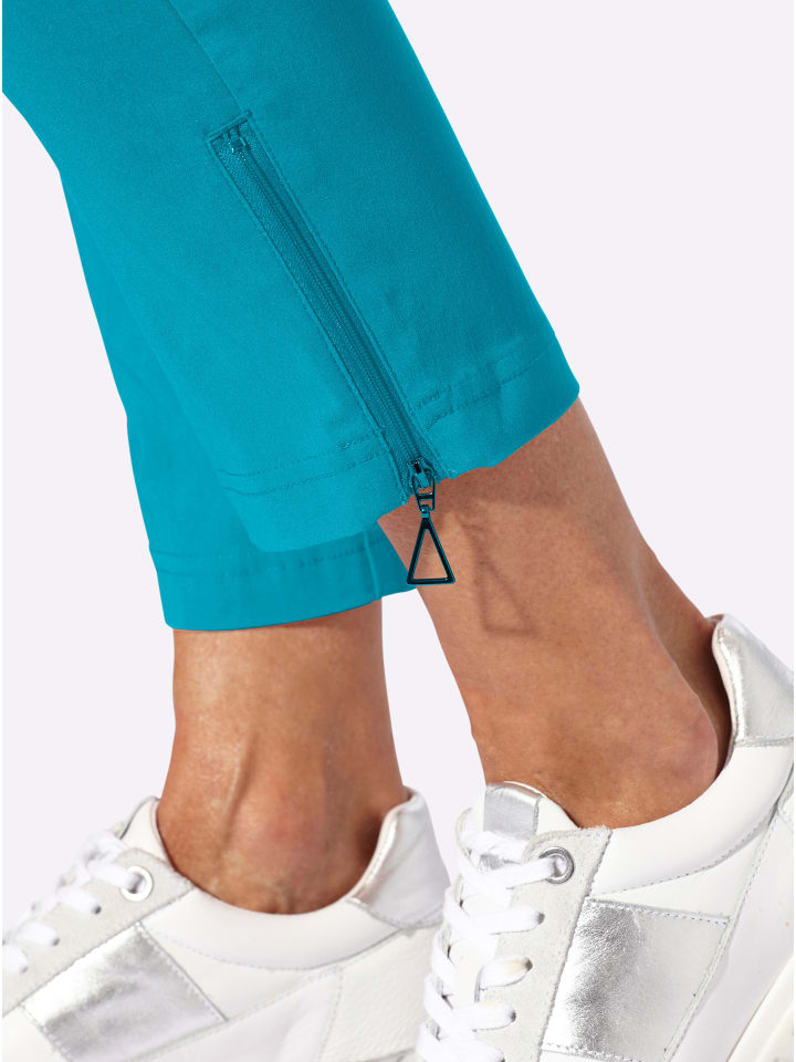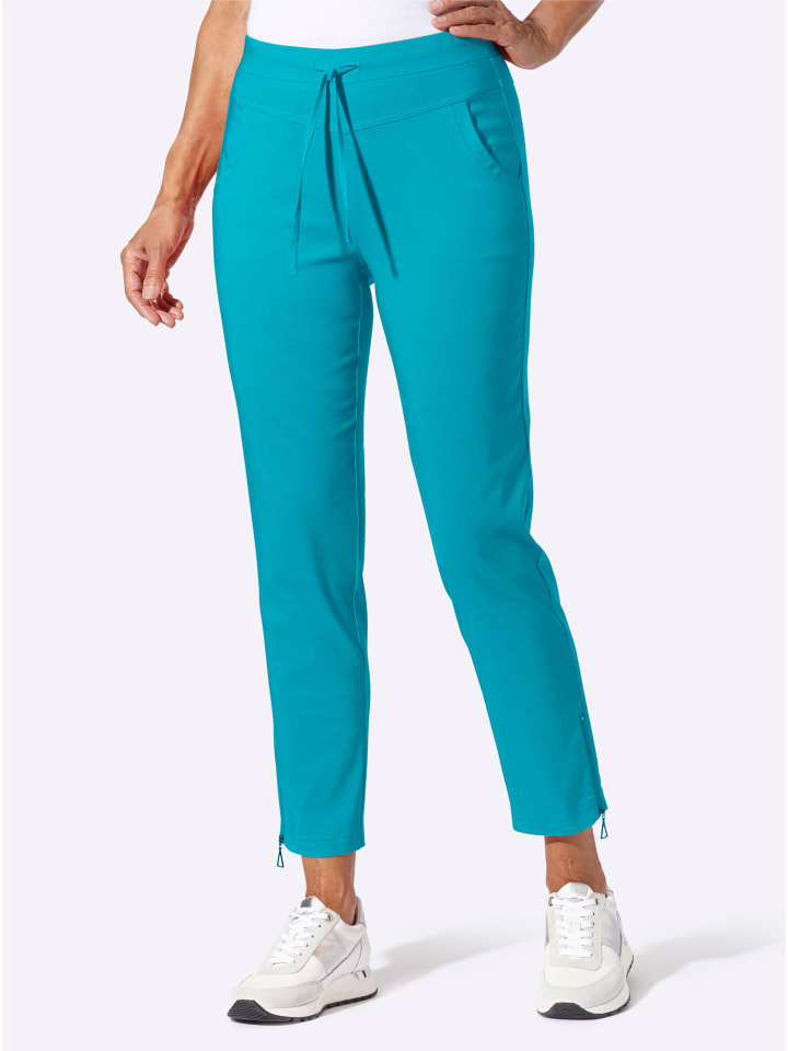 Комфорт и стиль: эластичные, удобные и сохраняющие форму брюки из бенгалина длиной до щиколотки. Эластичный пояс с кулиской и завязкой. Приталенная кокетка спереди и сзади. Два передних кармана и два накладных кармана сзади. Молния по низу брючины. Длина брючины примерно 34 см.