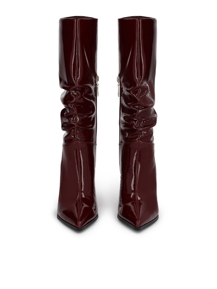 Феноменальные сапоги, сочетающие в себе роскошный блеск лакированной кожи и изысканный крой. Глубокого бордового оттенка, они излучают элегантность и станут стильным акцентом любого гардероба. Высокое голенище с изящной стрелкой подчеркивает современный и в то же время женственный характер модели. Тонкий каблук изящно приподнимает силуэт, придавая ему легкость и элегантность, а заостренный носок визуально укорачивает стопу и придает обуви утонченные линии. Модель для женщин, которые ценят классику в современной и смелой интерпретации. Эти сапоги идеально сочетаются с платьями и элегантными пальто, добавляя четкости и роскоши любому образу. Идеально подходят для особых случаев и дополняют шикарные осенне-зимние наряды.