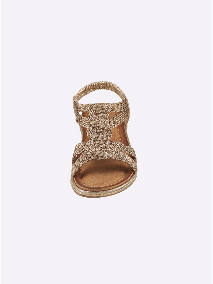 Сандалии из удобного тканого текстиля с металлическим эффектом. С эластичной пяткой. Стелька из искусственной кожи с мягкой подкладкой. Каблук-танкетка высотой около 25 мм.