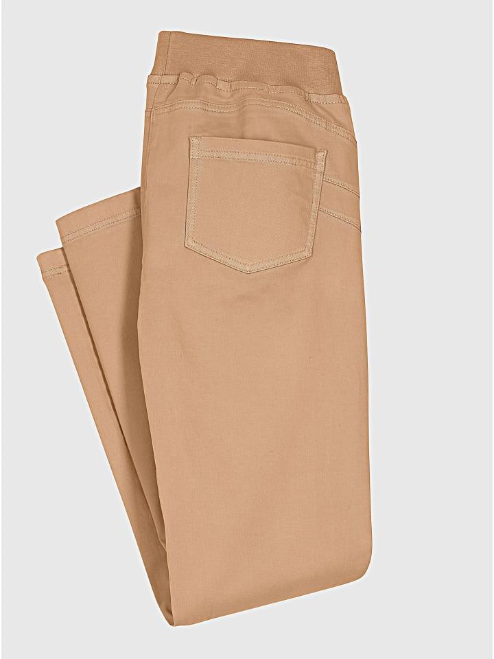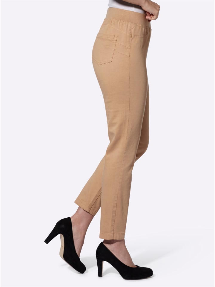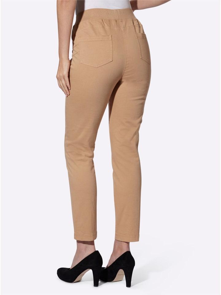 Узкие джинсы push-up из мягкой ткани с поясом на резинке. Эффект, подчеркивающий фигуру: смещенные вперед боковые швы, кокетка push-up сзади и две диагональные вытачки от бокового шва к карманам. Два ложных кармана спереди и два накладных кармана сзади. Длина брючины около 32 см. Соответствует инициативе «Сделано в Африке с хлопком».
