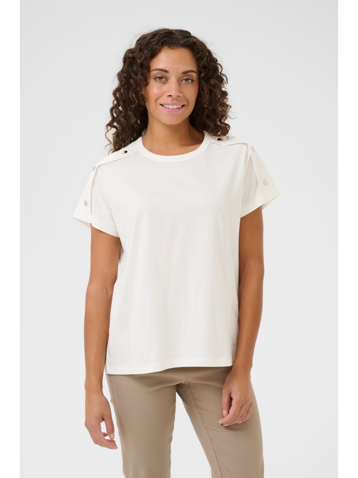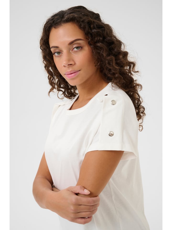 Футболка свободного кроя с мягкой поверхностью, круглым вырезом и короткими рукавами. Пуговицы на плечах и рукавах придают ей современный вид.
