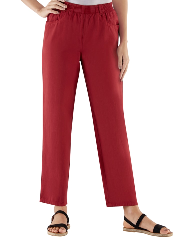 Брюки с удобным эластичным поясом, шлевками для ремня и двумя практичными карманами. Ширина брючины примерно 42 см.