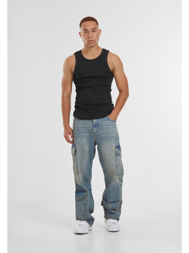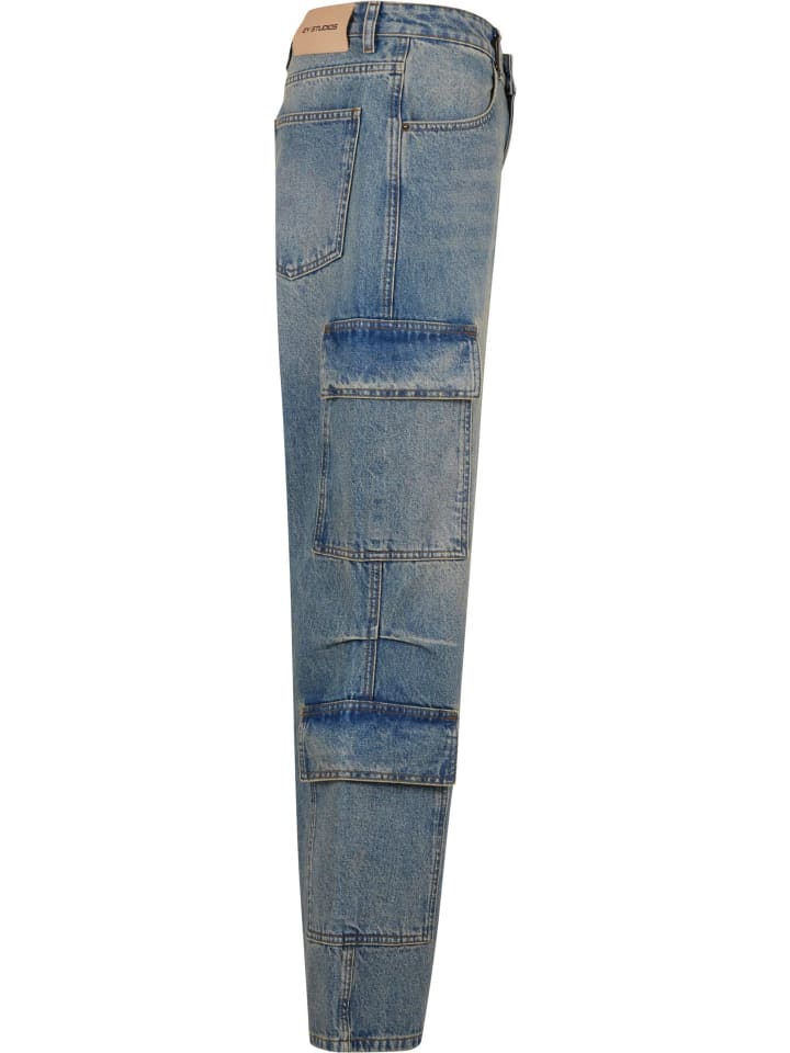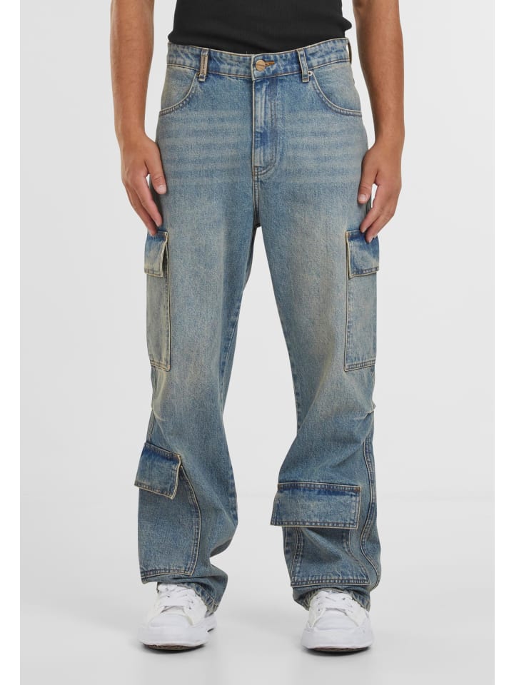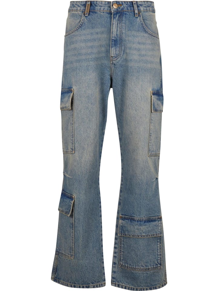 Джинсы Baggy & Loose с карманами-карго, идеально подходящие для повседневной носки и улицы, благодаря свободному крою и широким штанинам. Изготовленные из хлопкового денима, эти джинсы прочные, но удобные, со средней посадкой, создают легкий и непринужденный силуэт. Модель застегивается на пуговицу и молнию, имеет классические передние карманы и характерные накладные карманы с клапанами на бедрах и голенях, сочетая функциональность и структуру. Стандартный подол свободно спускается по обуви, обеспечивая свободу движений, а тонкие швы стабилизируют форму и подчеркивают городской, повседневный характер стиля.