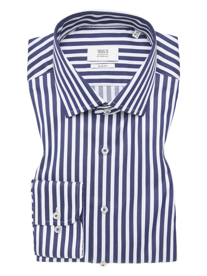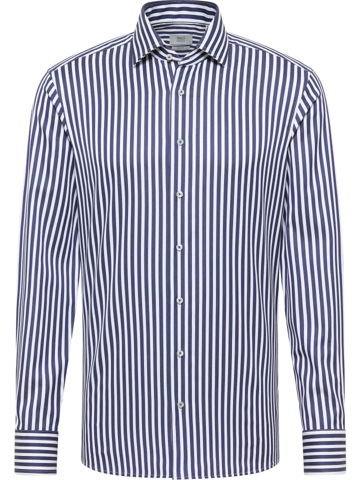 Эта полосатая рубашка с длинными рукавами приталенного кроя из нашей премиальной линейки 1863 by ETERNA - молодежный, спортивный, универсальный и стильный компаньон.