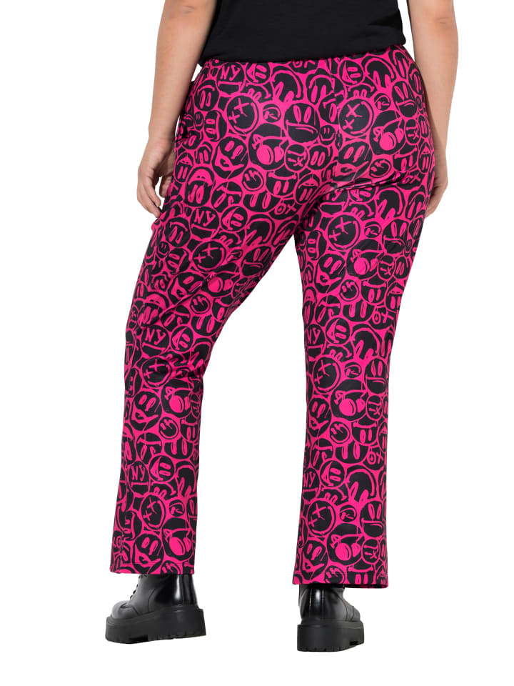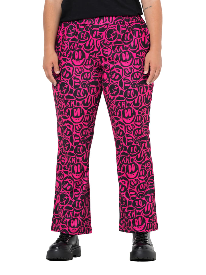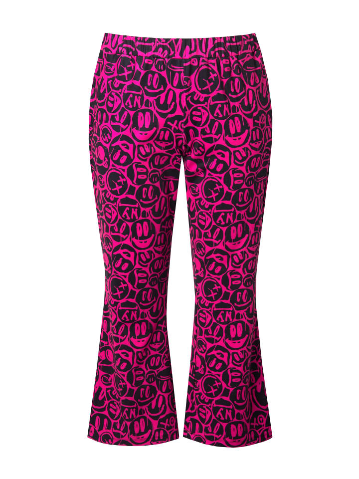 Брюки-клеш из эластичного трикотажа с принтом в виде смайлика. Эластичный пояс с боковыми карманами.