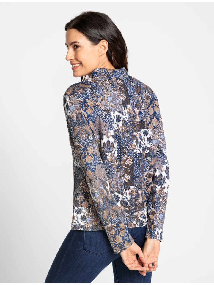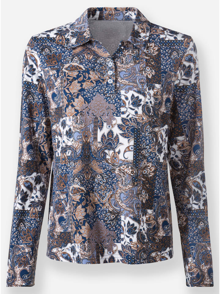 Образец: рубашка с рубашечным воротником, небольшим V-образным вырезом и короткой планкой с пуговицами с перламутровым эффектом. Сплошной узор пейсли в стиле пэчворк великолепно смотрится на приятной мягкой смеси материалов. Длинные рукава. Поддерживает инициативу «Хлопок, сделанный в Африке».