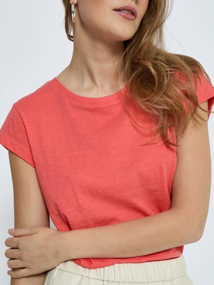 Наша новая простая футболка NOOS из пряжи типа «слабл»! Уже доступна в нескольких цветах. Футболка Leti от Minus - красивая и стильная футболка с короткими рукавами. У футболки красивый круглый вырез и очень короткие рукава. Идеально подходит для модной юбки с принтом.