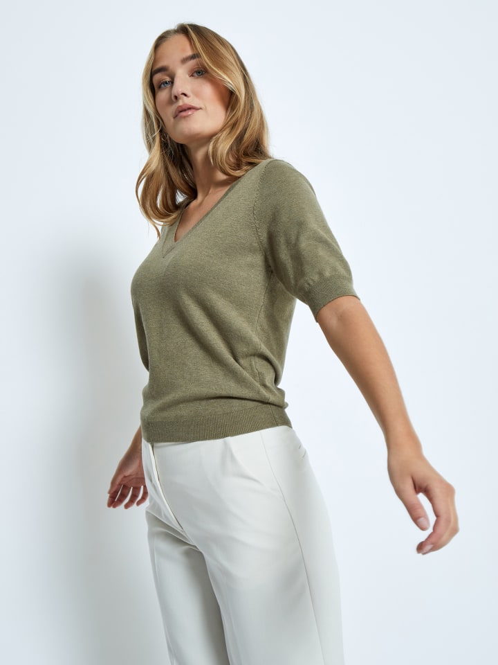 Эта футболка Milla - прекрасный базовый элемент осеннего гардероба благодаря сезонной расцветке. Футболка имеет привлекательный V-образный вырез и стильные ребристые детали на горловине, манжетах и подоле. Она изготовлена на 82% из экологически чистых материалов.