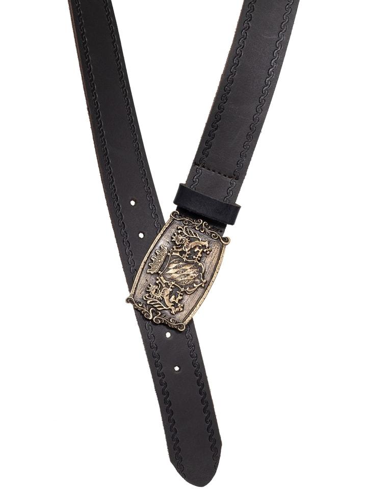 Пряжка с баварским гербом. Этот традиционный ремень графитового цвета отличается прочной спилок и большой декоративной пряжкой с античной отделкой. Эта высококачественная модель бренда Töpfer украшена штампованной каймой сверху и снизу кожи. Баварский герб, который держат два льва, особенно эффектен.
