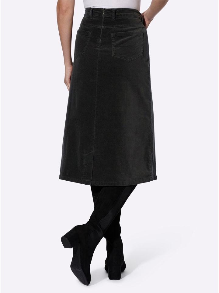 Юбка из тонко мерцающего высококачественного бархата, окрашенного в пряже, с классическим 5-карманным кроем. Слегка расклешенный силуэт, фигурный пояс со шлевками для ремня и декоративная планка с пуговицами. Потайная молния и предохранительная пуговица сзади, приталенная кокетка и потайная шлица сзади. Сертифицировано OCS.