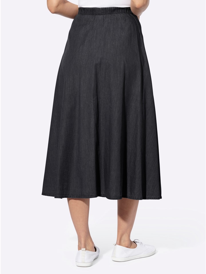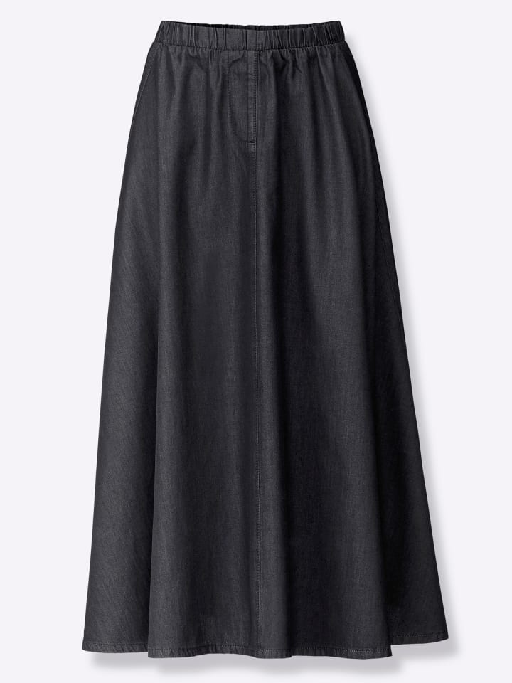 Великолепная мода может быть такой удобной! Юбка из денима в стиле «панель» с удобным эластичным поясом и имитацией застежки. Мягкая, струящаяся ткань. Сертификация GOTS.