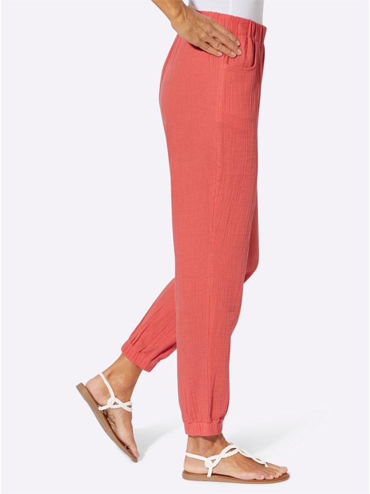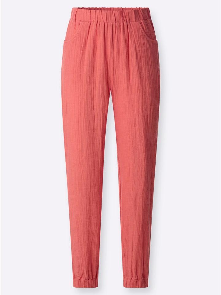 Чистая легкость! Удобные брюки из воздушного муслина. С резинкой на поясе, двумя боковыми карманами и резинкой по низу брючины. Длина брючины примерно 28 см.