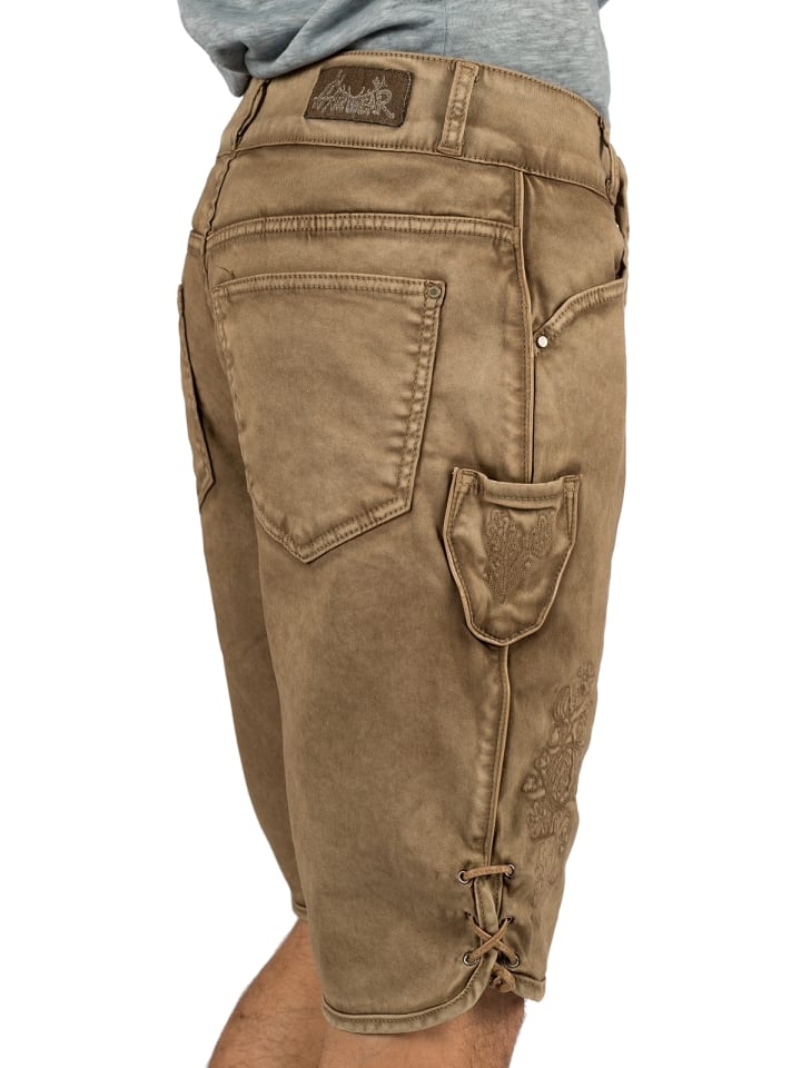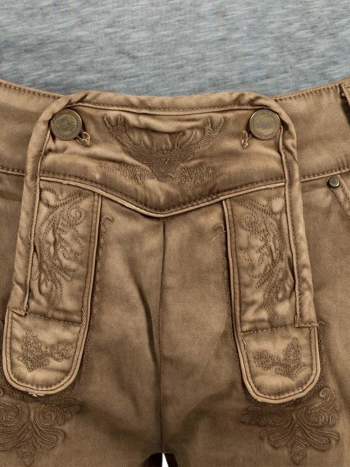 Короткие джинсы RALKO в традиционном стиле от Hangowear армейского зеленого цвета. Эти легкие хлопковые шорты в уникальном традиционном стиле обязательно привлекут внимание. Выбеленный вид армейского зеленого цвета идеально подходит для любителей активного отдыха. Типичные элементы традиционного стиля включают отложной гульфик с деревенской вышивкой. Светло-коричневая окантовка создает привлекательный контраст. Сзади шорты выглядят как обычные джинсы. Большие карманы вмещают множество мелких предметов. Эти традиционные шорты - идеальный выбор для лета.