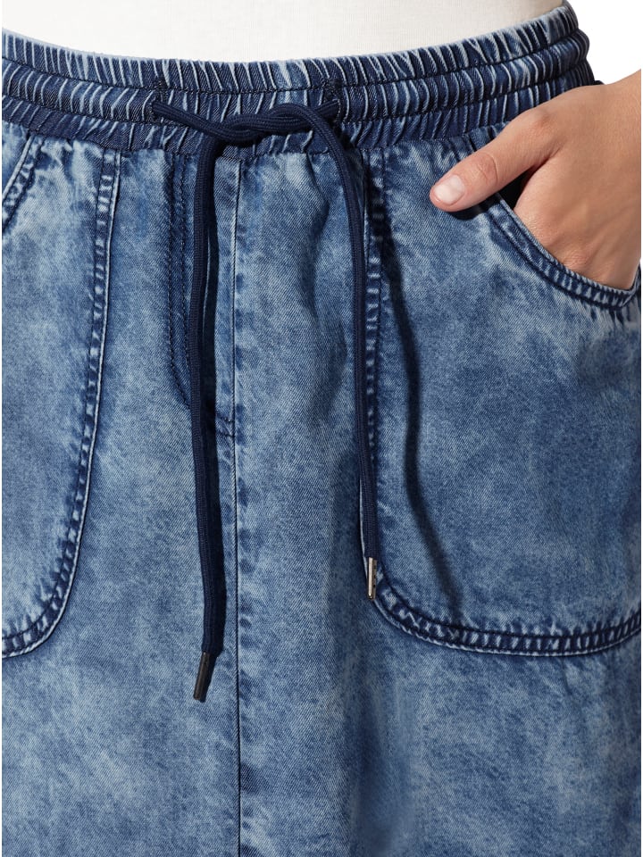 Юбка: Мягкая, струящаяся ткань в стиле повседневного денима с эффектом лунной стирки. Эластичный пояс со шнурком и кулиской, большие накладные карманы.