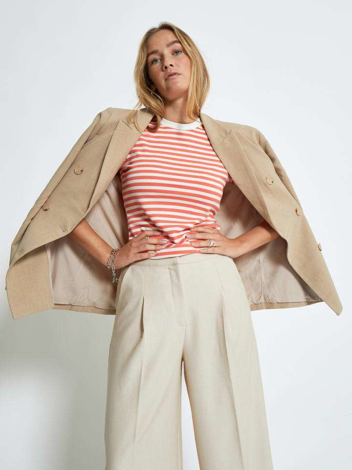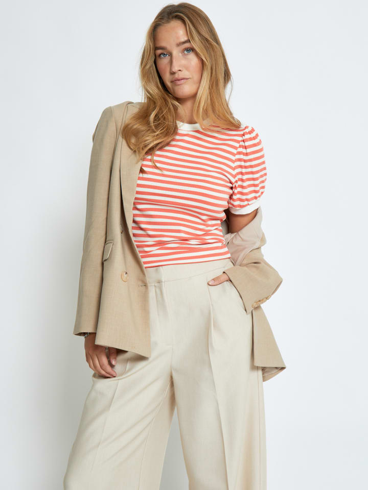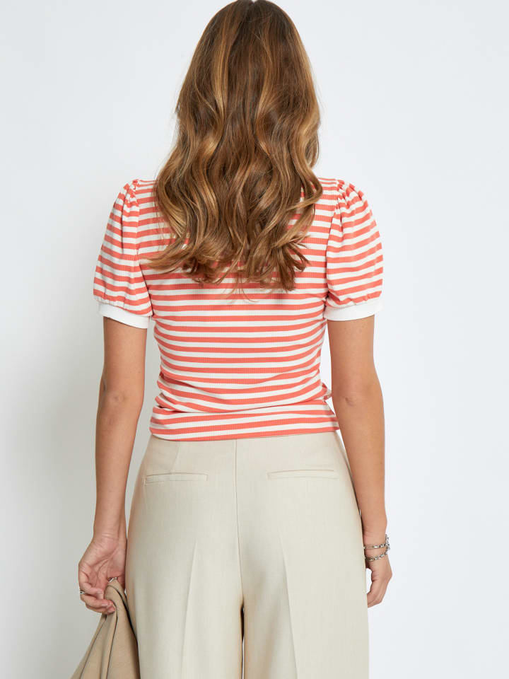 Украсьте свой повседневный гардероб полосатой футболкой MSJohanna, созданной для тех, кто ценит элегантность в повседневной одежде. Круглый вырез горловины создает классический силуэт, идеально дополняющий структурированную, но мягкую ткань, которая нежно ласкает ваше тело. Изюминкой являются искусно выполненные короткие рукава, украшенные мягкими сборками, которые добавляют объем и изысканность. Изящные ребристые детали по всей футболке подчеркивают ее обтекаемый вид, обеспечивая комфорт и воздухопроницаемость. Легко сочетайте ее с любимыми джинсами или юбкой строгого кроя, чтобы создать шикарный ансамбль, который легко перейдет как с дневного, так и с вечернего гардероба.
