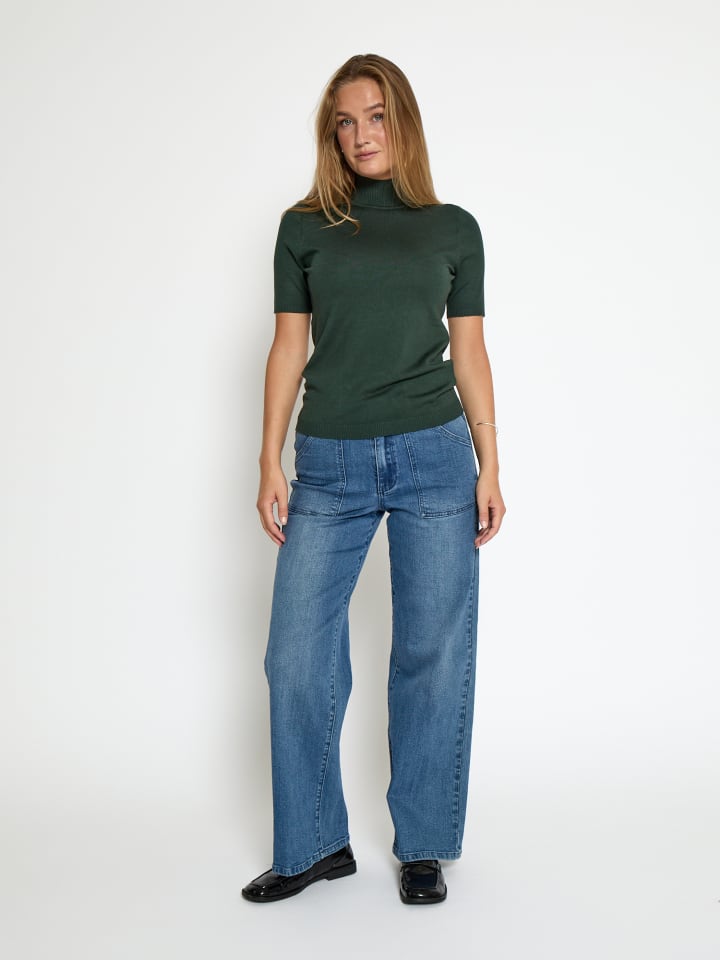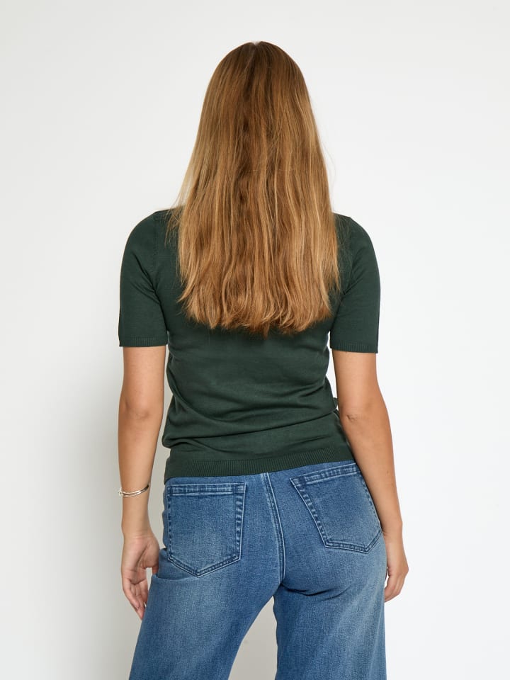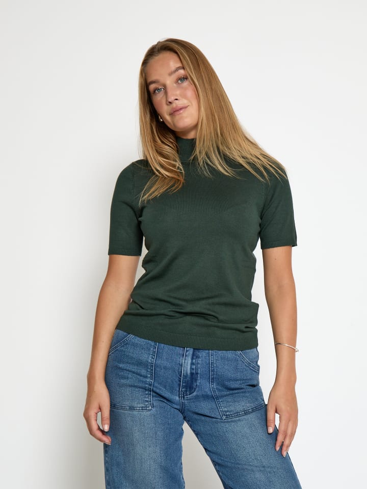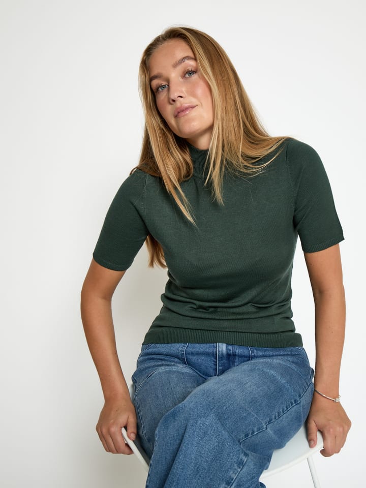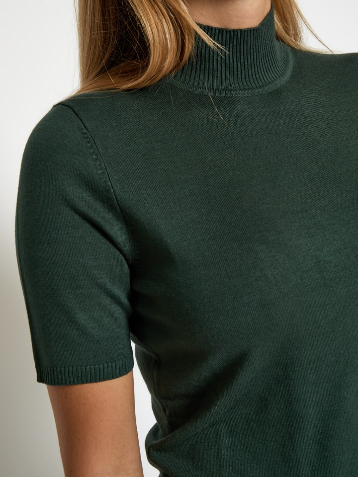 Из нашей программы NOOS. Простая классическая трикотажная блузка с высоким ребристым воротником и короткими рукавами. Удобная эластичная ткань. Эту базовую блузку можно носить по любому поводу. Качество - наш известный трикотаж Eco-Vero (вискоза из экологически чистых материалов), такой же, как у кардигана New Laura.