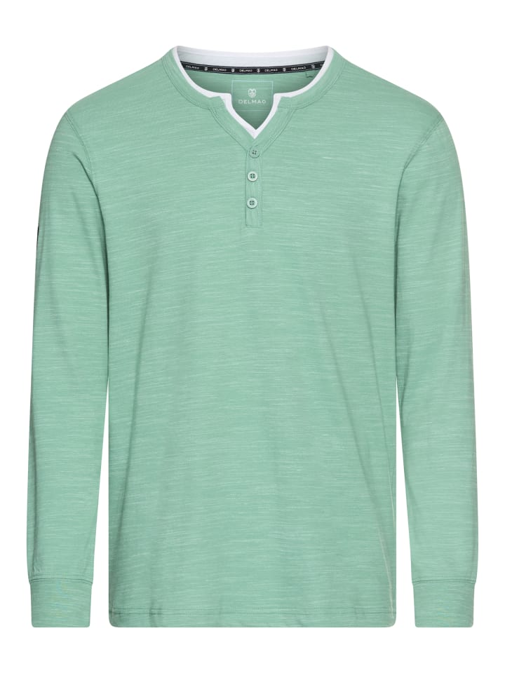 Простая мужская рубашка-хенли от DELMAO с меланжевым узором. Классический крой и планка на пуговицах. Стильный значок дополняет образ. Эластичный и эластичный трикотаж обеспечивает мягкое облегание.
