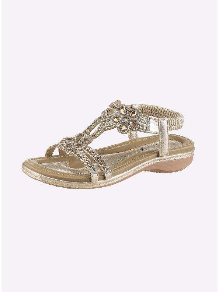 Сандалии в модном металлическом стиле с отделкой стразами, изготовлены из приятного текстильного материала. Эластичный задник. Мягкая стелька из искусственной кожи. Гибкая подошва. Каблук-танкетка высотой около 35 мм.