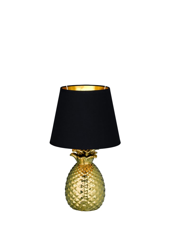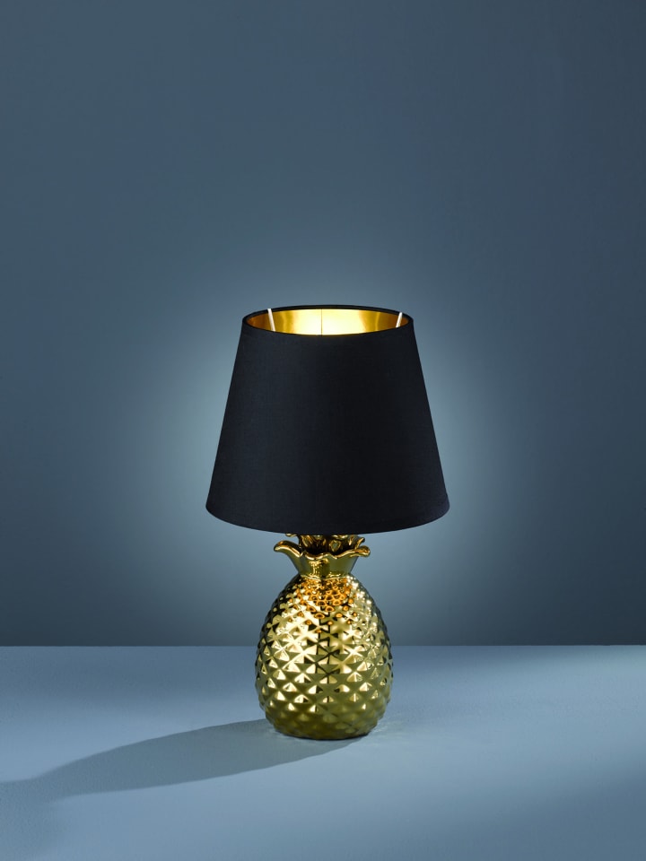 Модный стиль: настольная лампа! Настольная лампа PINAPPLE с простым тканевым абажуром и основанием в форме ананаса станет стильным акцентом в дневное время и обеспечит приятное освещение вечером. Высота лампы 35 см, она станет прекрасным аксессуаром для полок, комодов или небольших столиков. Золотистое основание в форме ананаса изготовлено из керамики, а простой тканевый абажур - черный снаружи и золотой внутри. Эти два цвета идеально гармонируют, создавая элегантный общий вид. Для энергосберегающего освещения мы рекомендуем использовать светодиодные лампы. Они являются идеальной альтернативой обычным галогенным лампам, обеспечивая высокое качество света и экономию энергии до 80%. Кроме того, светодиодные лампы обладают такими преимуществами, как длительный срок службы, низкое тепловыделение и экологичность.