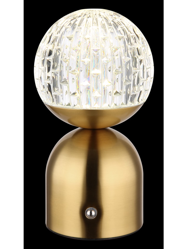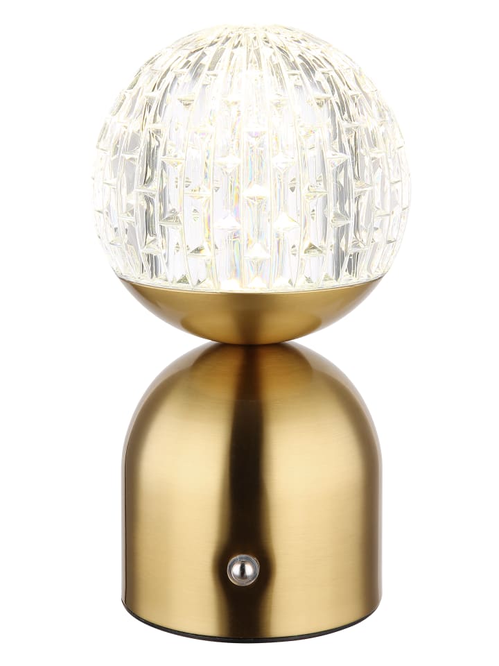 Настольная лампа, металл, матовая латунная отделка; прозрачный акрил с кристаллическим эффектом; белый кабель из ПВХ; сенсорное включение/выключение; регулировка яркости; бесступенчатый сенсорный диммер; блокировка цвета; USB-A 2.0 - USB-C; в комплекте батарея CR18650 1200 мАч 3,7 В; время зарядки батареи: около 4 часов; диаметр: 105 мм; высота: 200 мм; длина кабеля: 500 мм; в комплекте светодиод 2,5 Вт 5 В, источник 243 лм, светоотдача 173 лм, цветовая температура 2700/4000/6500 К