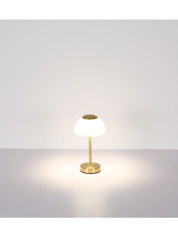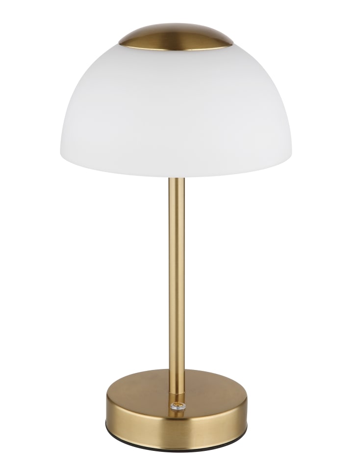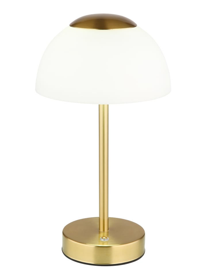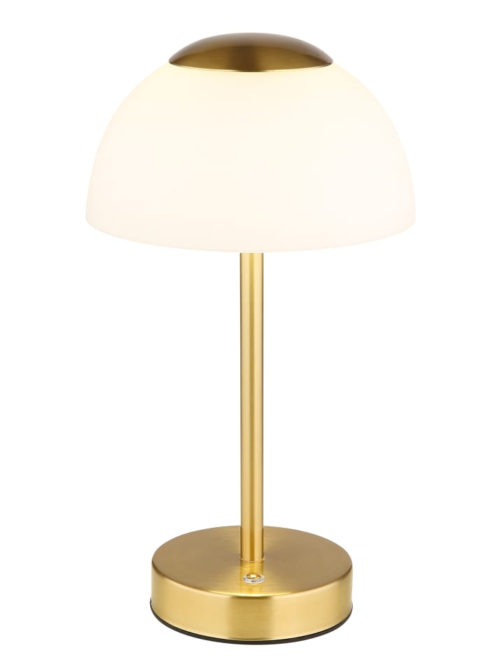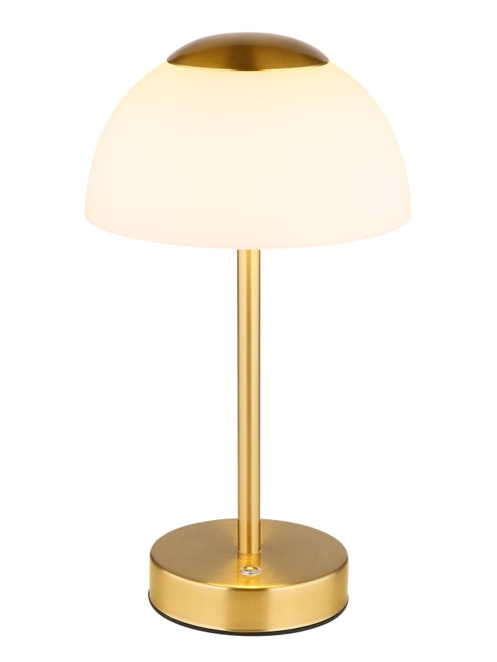 Настольная лампа, металл, матовая латунная отделка, опаловое стекло, белый кабель из ПВХ, сенсорное включение/выключение, регулировка яркости, плавная регулировка яркости, блокировка цветов, USB-A 2.0 - USB-C, в комплекте аккумулятор CR18650 1800 мАч 3,7 В, время зарядки около 4 часов, время работы около 6-8 часов, диаметр: 150 мм, высота: 310 мм, длина кабеля 500 мм, в комплекте светодиод 2,5 Вт 230 В, источник света 243 лм, светоотдача 150 лм, цветовая температура 2700/6500/4000 К