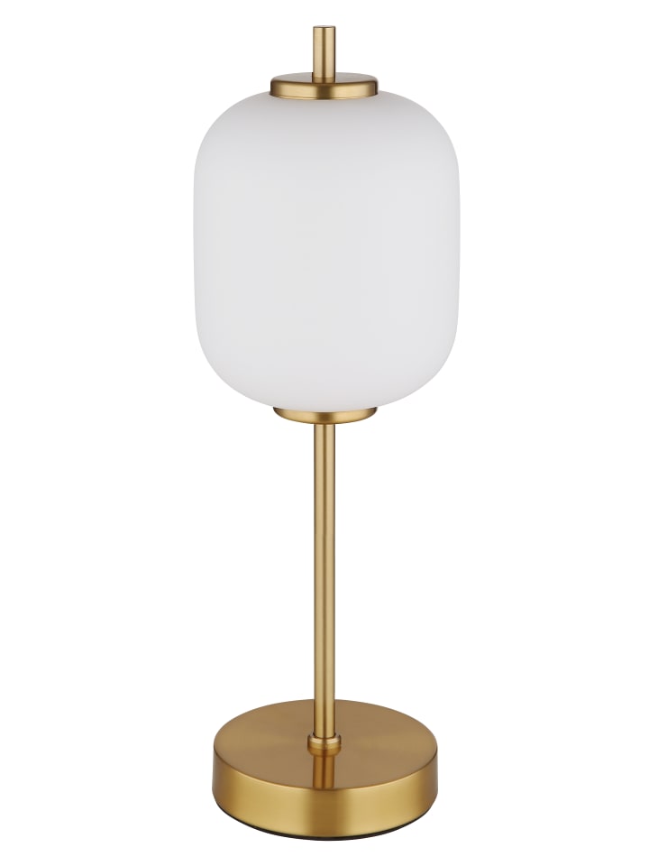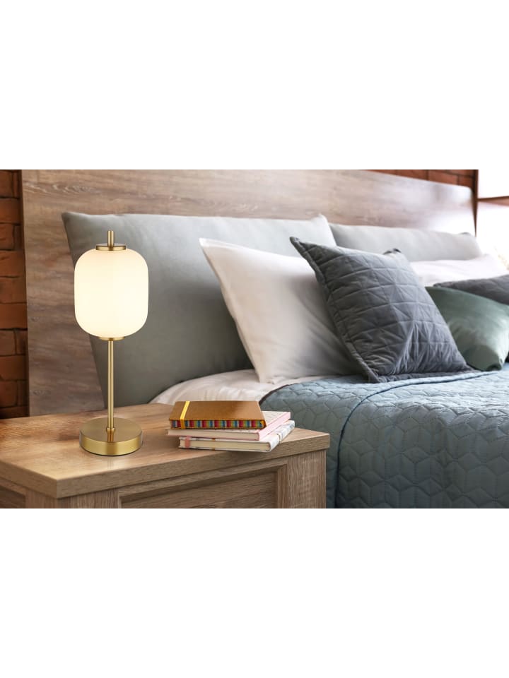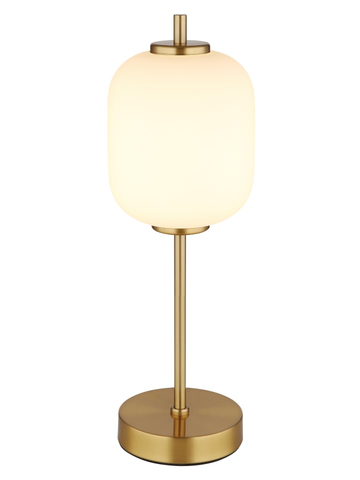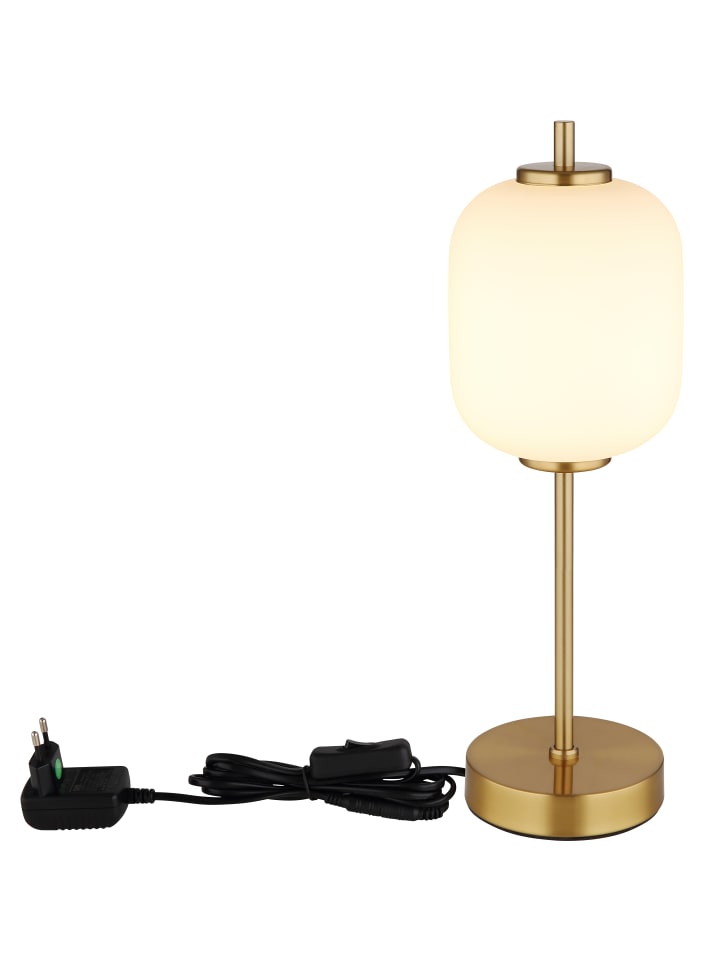 Настольная лампа, металл цвета латуни, опаловое стекло, черный кабель из ПВХ, клавишный выключатель на кабеле, диаметр: 135 мм, высота: 400 мм, длина кабеля: 1500 мм, в комплекте светодиод мощностью 6 Вт, 230 В, источник света: 566 лм, световой поток: 428 лм, цветовая температура: 3000 К
