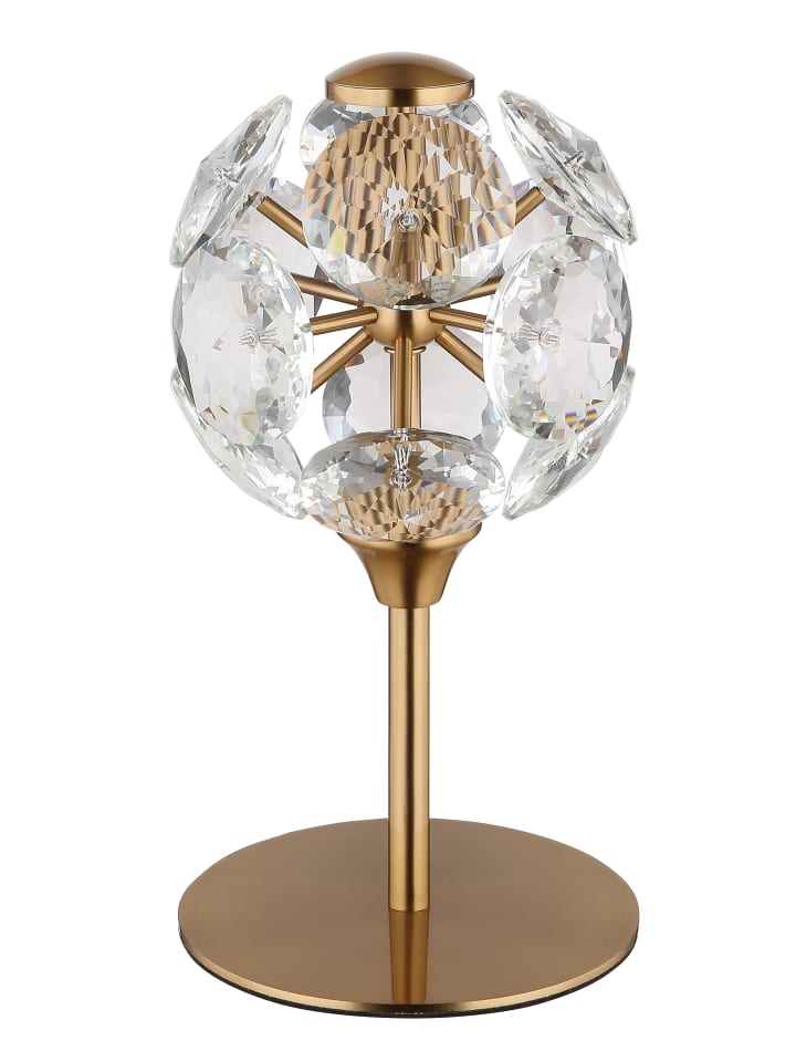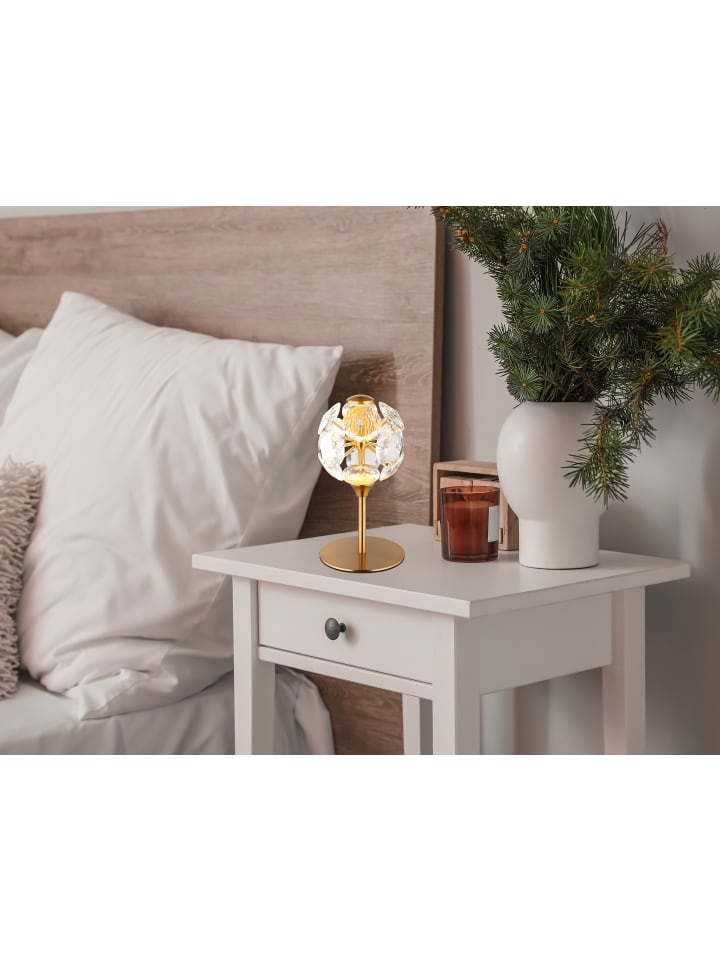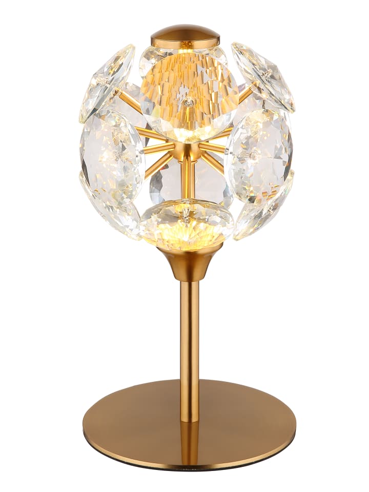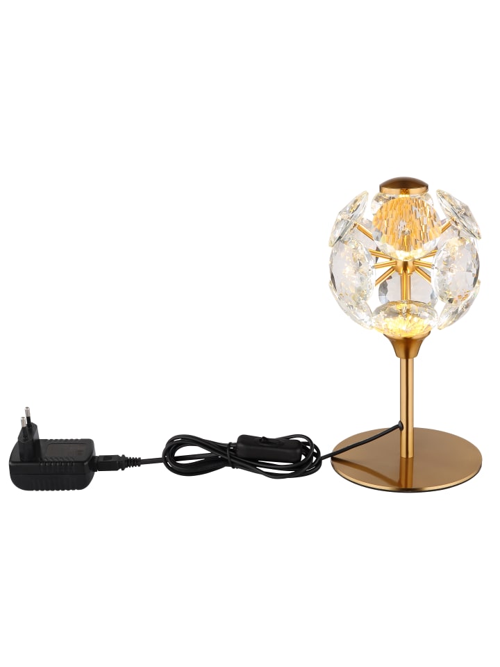 Настольная лампа, металлическая, золотистого цвета, прозрачные кристаллы K9, черный кабель из ПВХ, клавишный выключатель на кабеле, диаметр: 150 мм, высота: 265 мм, длина кабеля: 1500 мм, в комплекте светодиод 8 Вт 230 В, источник света: 900 лм, световой поток: 600 лм, цветовая температура: 3000 К
