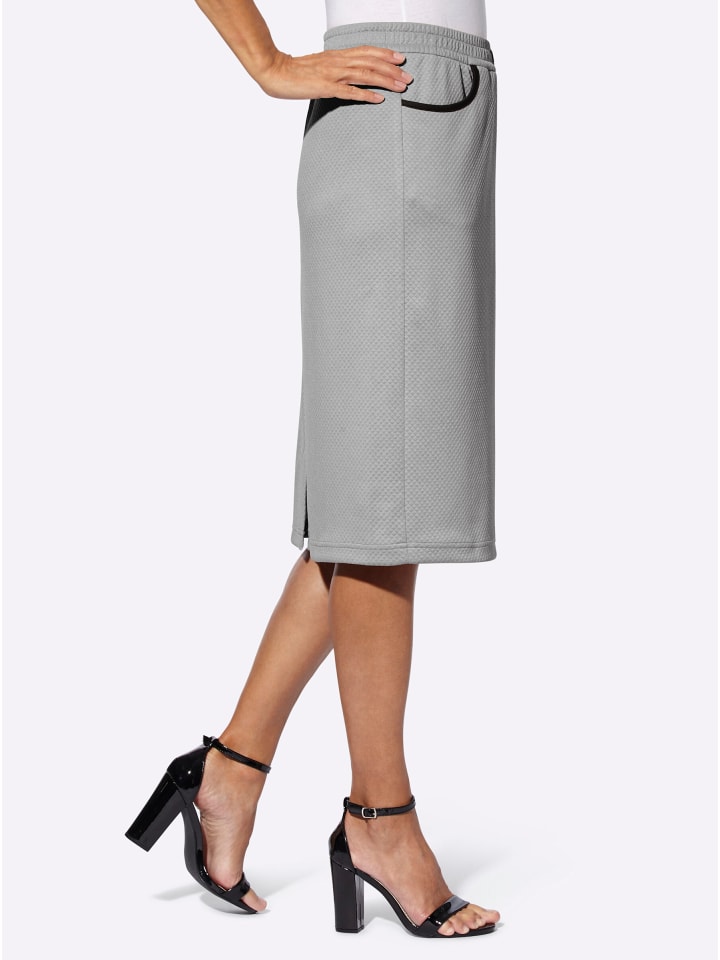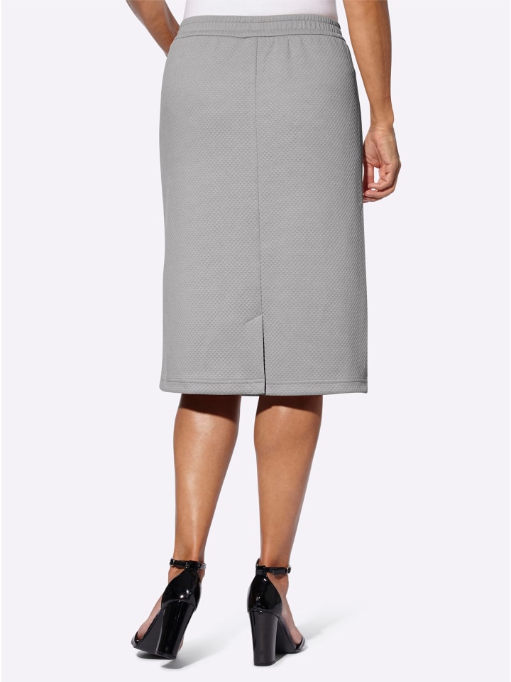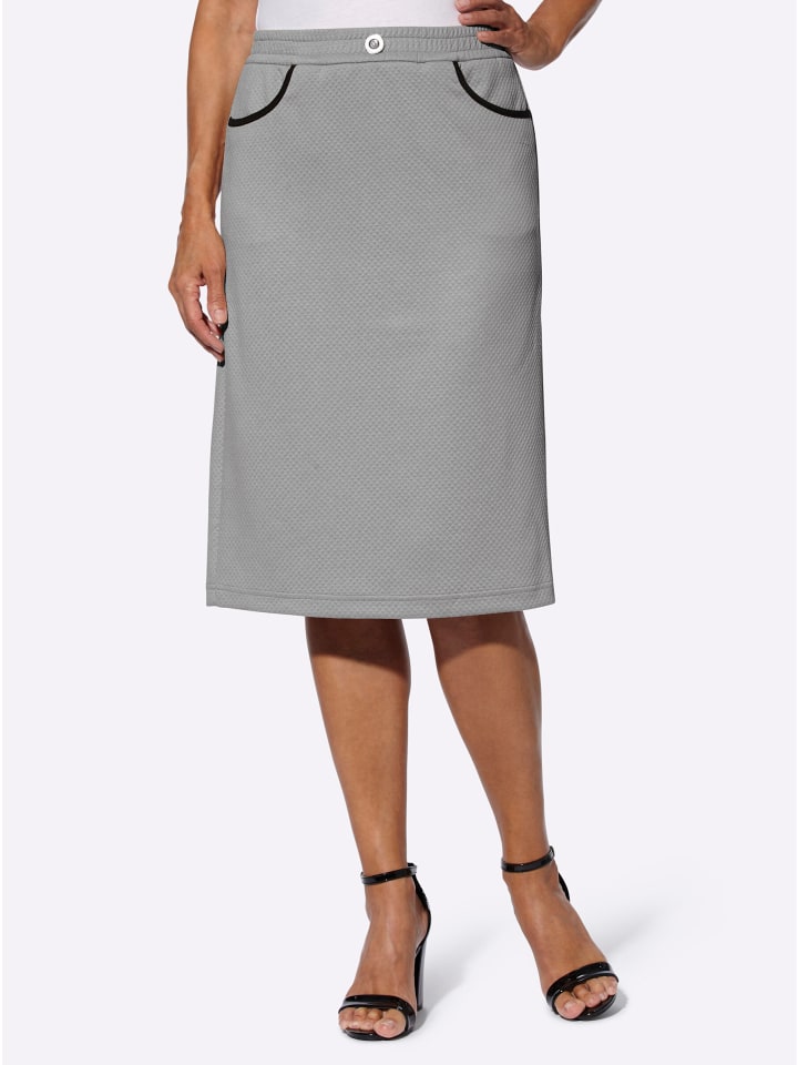 Мода может быть такой удобной! Юбка из джерси, сохраняющая форму, из слегка текстурированной ткани, которая совсем не мнется. Удобный фасон, легко надевается, с эластичным поясом и декоративной пуговицей. Карманы с контрастной окантовкой.