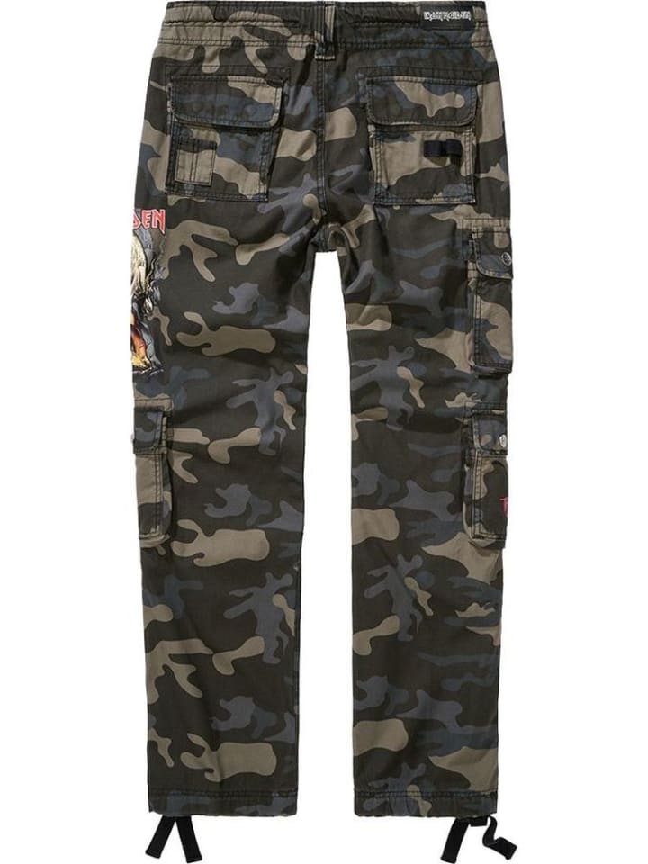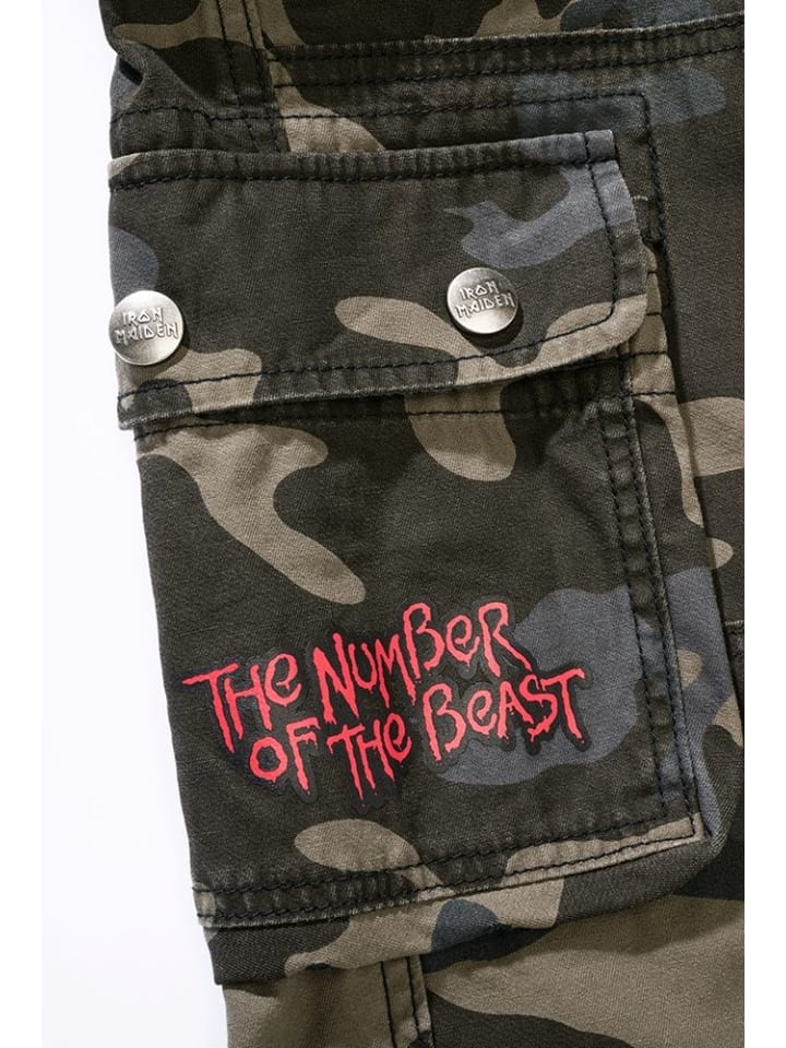 Стильные облегающие брюки-карго / Прочный, приятный для кожи хлопковый материал / Большой разноцветный принт Iron Maiden на левой штанине / Пуговицы с логотипом / Печать Notb на кармане правой штанины / Съемная металлическая брошь Iron Maiden Eddie / Облегающий крой / Шлевка для ремня из искусственной кожи Iron Maiden сзади / Регулируемый пояс со шнурком / Высококачественная гульфик на пуговицах / 2 боковых кармана / 4 практичных кармана-карго с застежкой на кнопку / 2 задних кармана / Прочные шлевки для ремня / Модный принт на одном кармане-карго