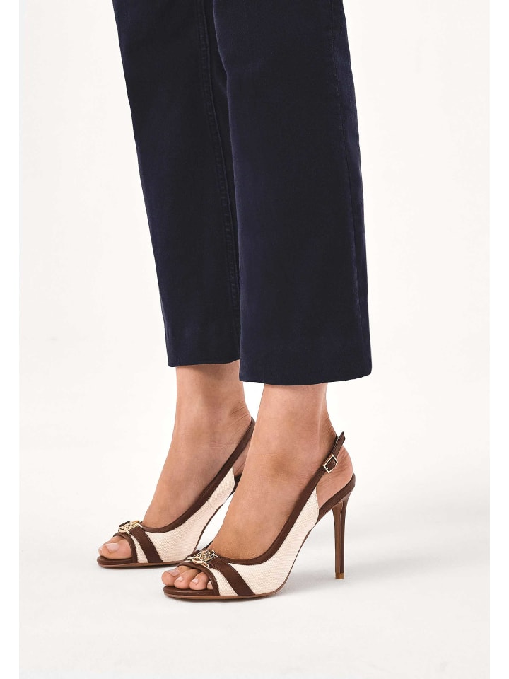 Эти сандалии, изготовленные из комбинации коричневой натуральной кожи и бежевой ткани, отличаются интересным контрастом фактур и цветов, что придает им уникальный стиль. Высокий каблук визуально стройнит ноги. Боковые элементы дополнены элементами, а использование мягкой бежевой ткани обеспечивает легкость и комфорт. Металлическая монограмма на передней части обуви - изящное, но эффектное украшение, добавляющее нотку роскоши. Сочетание цветов и материалов делает эти туфли подходящими как для летних, так и для более официальных нарядов.