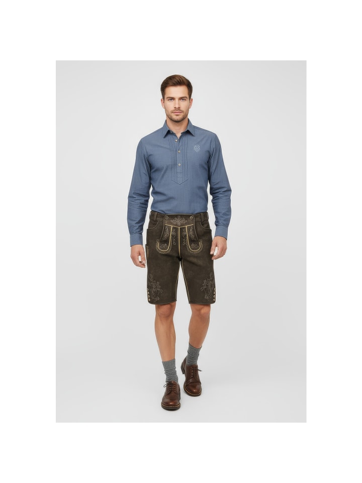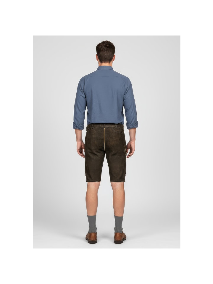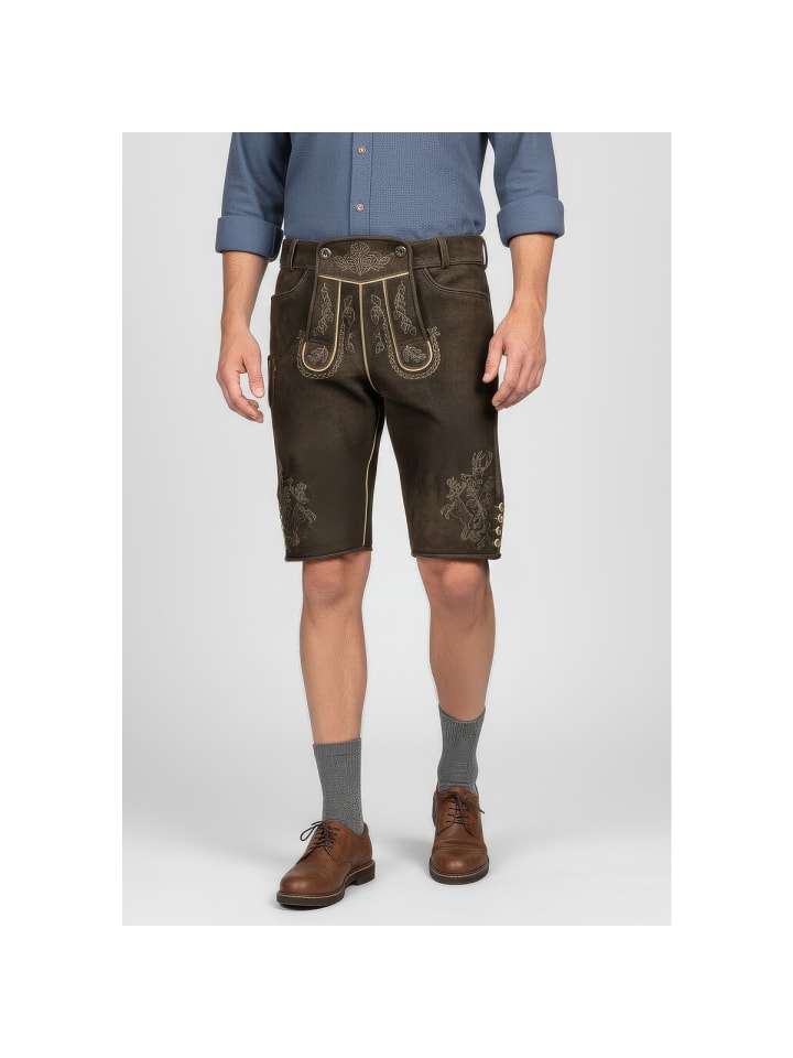 Кожаные бриджи Theodor от Krüger - абсолютный маст-хэв на Октоберфесте. Мягкий, эластичный кожаный верх с эффектной вышивкой на бедрах и нагруднике делает их настоящей приманкой для глаз. Еще одна изюминка - пряжка ремня с замысловатым декором. Ластовица сзади позволяет легко отрегулировать бриджи по обхвату талии. Стильные пуговицы на нагруднике и штанинах идеально дополняют эти элегантные кожаные бриджи. Сзади также есть карман для кошелька. На правой штанине вы найдете небольшой карман для хранения мелочей, например, мелочи. Эти кожаные брюки сочетают в себе традиционное мастерство с практичными деталями и станут настоящей приманкой для глаз на Октоберфесте. - Мягкая и эластичная кожа - Брюки с ремнем - Изысканная вышивка - Ластовица на поясе для легкой регулировки по обхвату талии - Задний карман для кошелька. Материал: 100% кожа