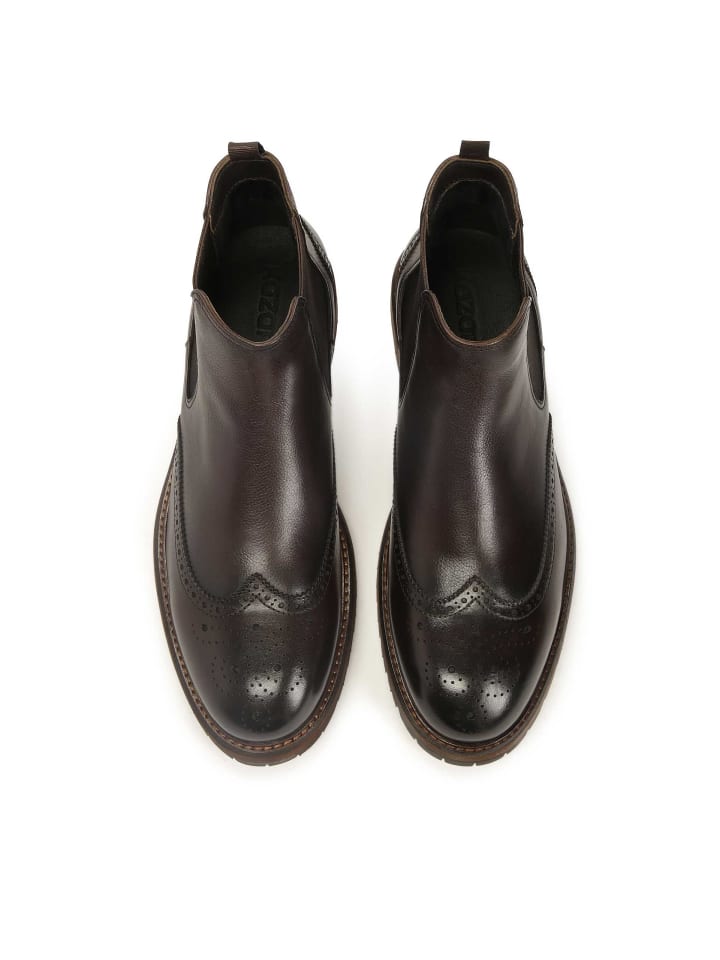 Эти коричневые кожаные ботинки челси - классический выбор для элегантного осенне-зимнего образа. Зернистый верх украшен изящной розеткой в стиле броги, добавляя вневременной штрих, вдохновленный британскими традициями. Эластичные боковые вставки обеспечивают легкость надевания и идеальную посадку, а прочная многослойная подошва с выраженным протектором обеспечивает комфорт и сцепление на различных поверхностях. Эти ботинки челси подойдут как для элегантного повседневного, так и для классического образа, сочетая элегантность с повседневной практичностью.