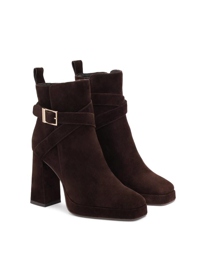 Коричневые сапоги на каблуке - стильная и удобная обувь, сочетающая классическую элегантность с современным дизайном. Изготовленные из мягкой высококачественной замши, они впечатляют бархатистой текстурой и глубоким теплым коричневым оттенком, который идеально подходит как для повседневных, так и для более изысканных образов. Сапоги имеют широкий, устойчивый каблук и платформу спереди, что обеспечивает комфорт и поддержку, визуально стройня силуэт. Молния на внутренней стороне голенища позволяет легко надевать их и обеспечивает идеальную посадку. Модным акцентом является перекрещивающийся ремешок с пряжкой, который украшает голенище и придает сапогам современный, слегка дерзкий характер. Стиль, который отлично сочетается с повседневным образом.