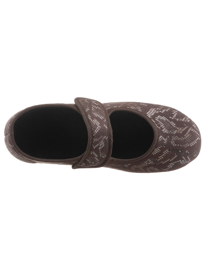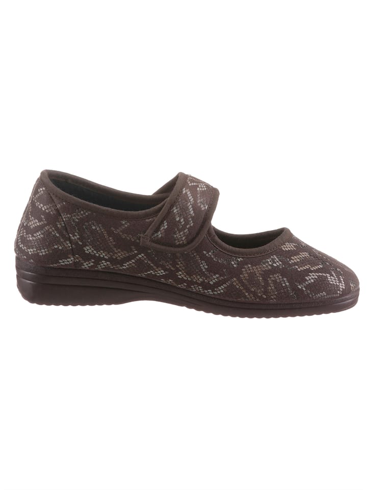 Удобные тапочки - благодаря эластичному текстильному верху в модном дизайне, идеально подходят для чувствительных ног, особенно в передней части стопы. С регулируемой застежкой на липучке. Противоскользящая резиновая подошва с танкеткой высотой около 30 мм. Ширина G.