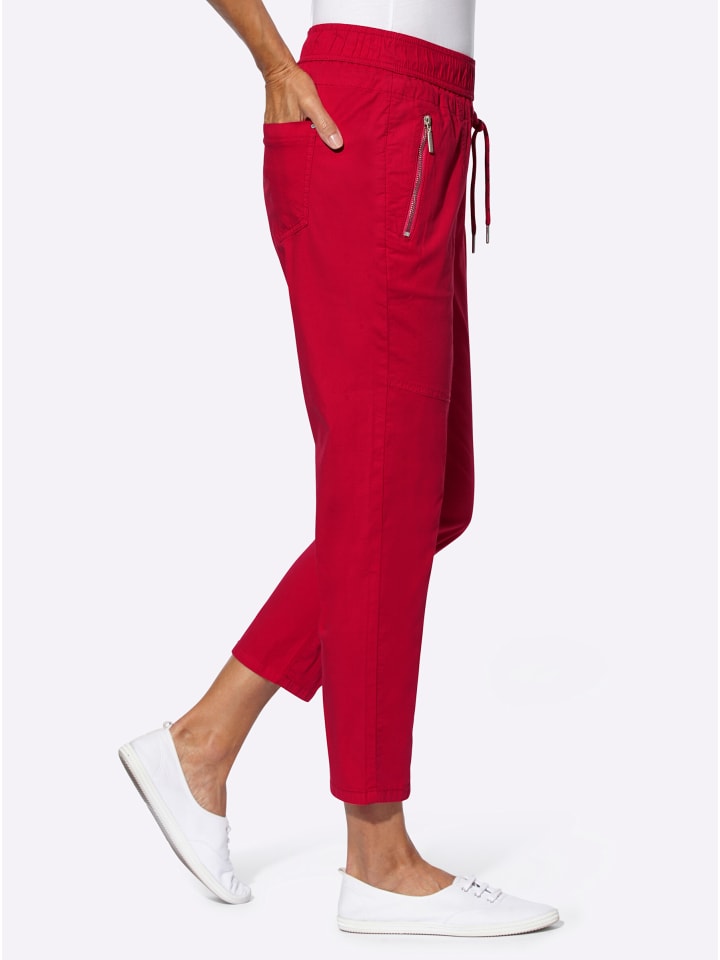 Просто наденьте их, и вы готовы к выходу: приятные и легкие брюки длиной 7/8 с очень удобным поясом на резинке по всему периметру, завязывающимся шнурком. Практичность: два косых кармана на молнии и два накладных кармана сзади. Передние швы визуально удлиняют штанину. Длина брючины примерно 36 см. Соответствует инициативе «Сделано в Африке с хлопком».