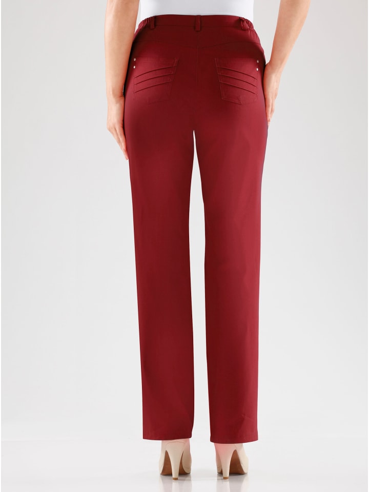 Брюки благодаря популярной нано-обработке отталкивают грязь, не мнутся, дышащие и простые в уходе. Шлевки для ремня и эластичный пояс по бокам. Два передних кармана и задние карманы украшены складками и заклепками. Длина брючины примерно 44 см. Ремень в комплект не входит.