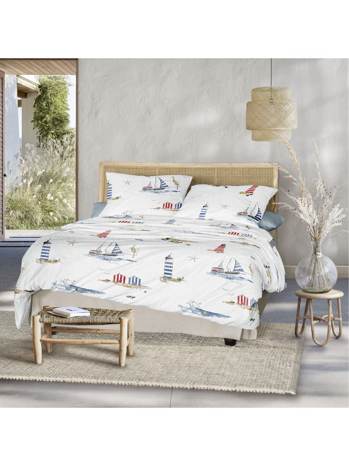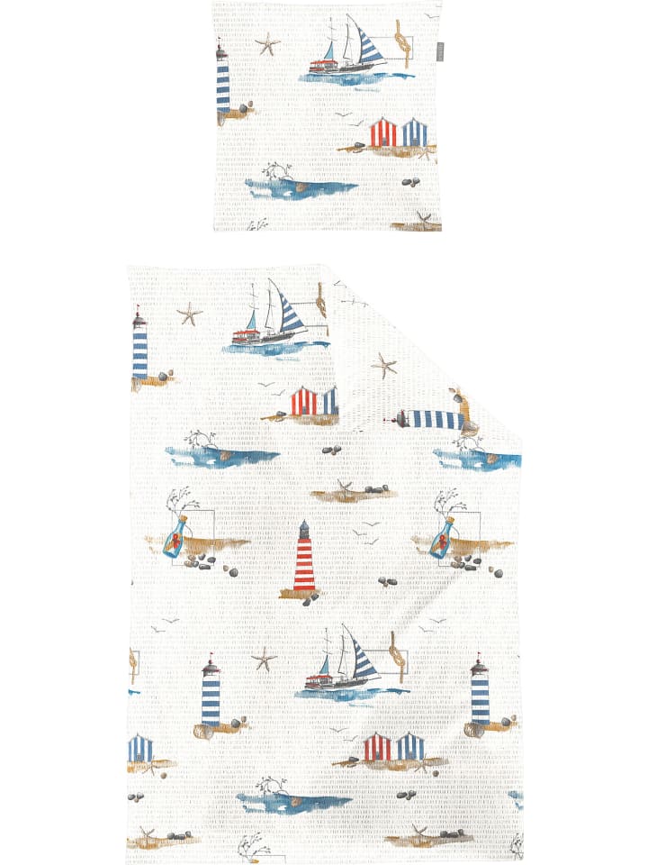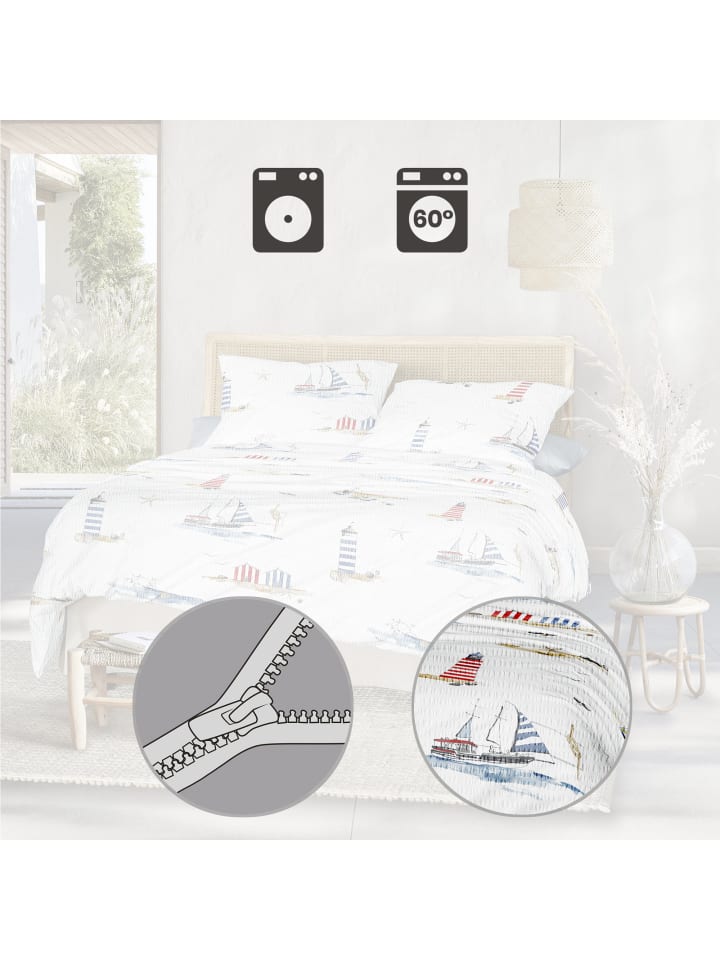 Постельное белье Irisette Soft Seersucker. Создайте атмосферу отпуска в своем доме с этим постельным бельем в морском стиле. Маяки, парусники и пляжные домики манят вас помечтать. Приятная мягкость и нежность с характерными гофрированными полосками - настоящее удовольствие для теплых летних ночей. Благодаря такой структуре постельное белье ощущается легким и воздушным. Оно не только терморегулирует и отводит влагу, но также дышащее и нежное к коже. Вас быстро поразит простота ухода, ведь это простое постельное белье не мнется - просто постирайте, высушите, и благодаря молнии оно быстро готово к использованию.