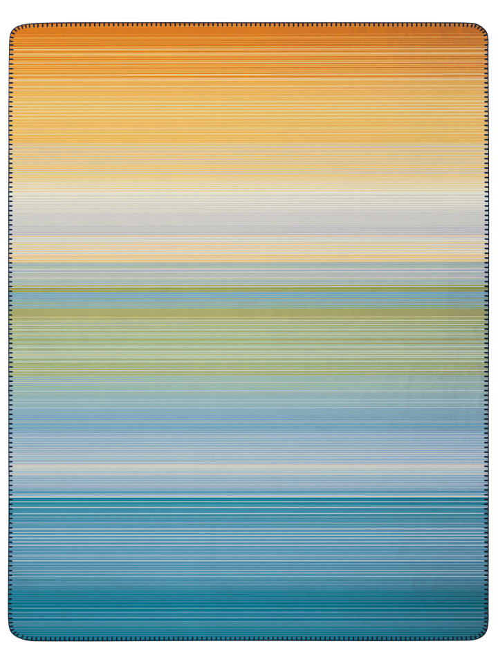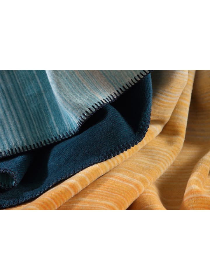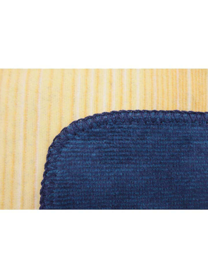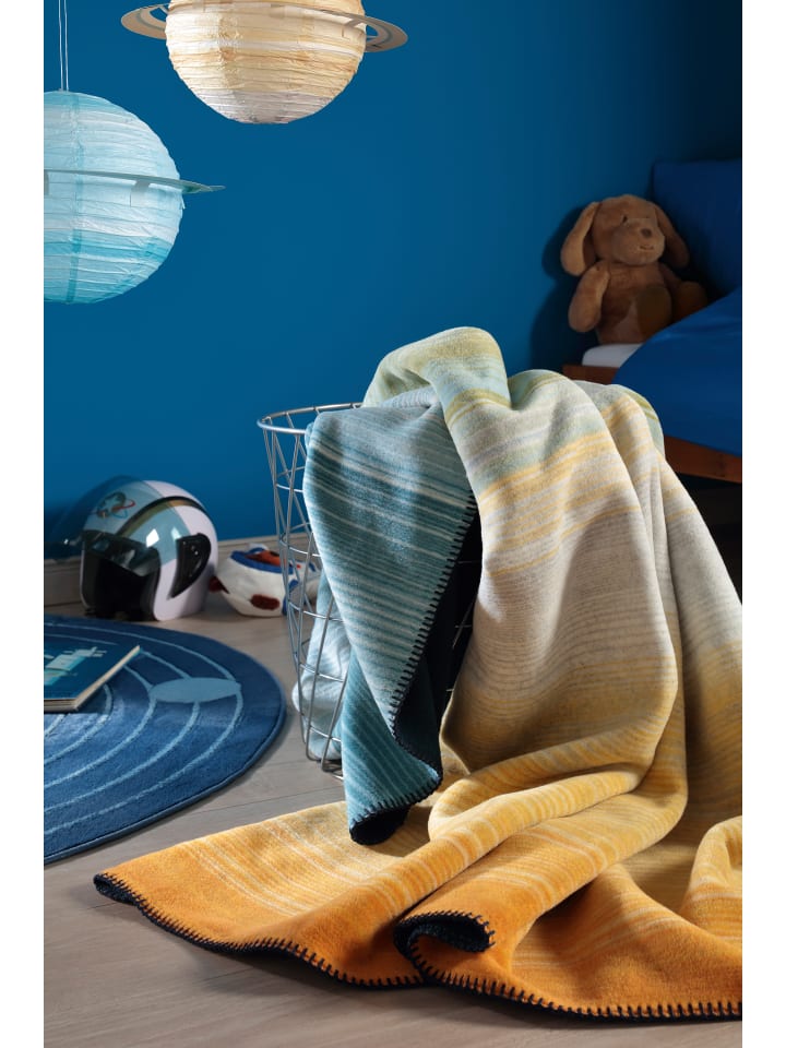 Это универсальное двустороннее одеяло радует глаз своей двухсторонностью. Тонкие полоски украшены интенсивным градиентом солнечно-желтого и светло-голубого цветов, создающим эффектный контраст с темно-синей изнанкой. Это детское одеяло размером 150 x 200 см, изготовленное из высококачественной хлопковой смеси, пушистое, приятное на ощупь и простое в уходе. Оно также станет отличным выбором для ребенка.