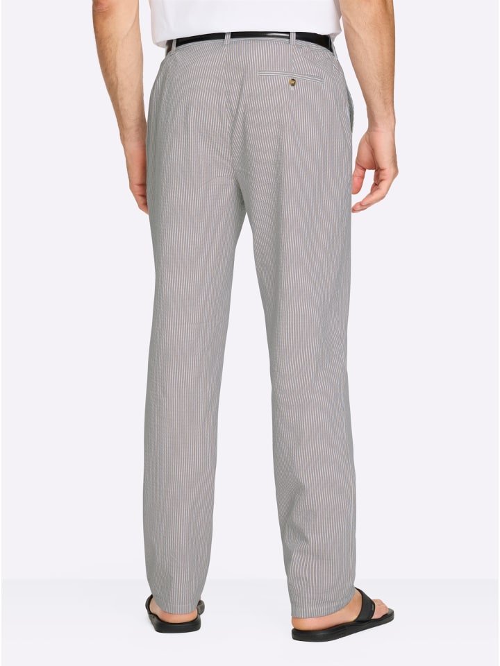 Брюки Marco Donati из легкого летнего сирсакера с полосатым узором, окрашенным пряжей. Забудьте о глажке: просто постирайте, высушите и носите снова! Удобные благодаря эластичному поясу сбоку с застежкой на пуговицу и молнию, а также шлевкам для ремня. Два боковых кармана и один карман на пуговице сзади. Ремень в комплект не входит. Поддерживает инициативу «Хлопок, сделанный в Африке».