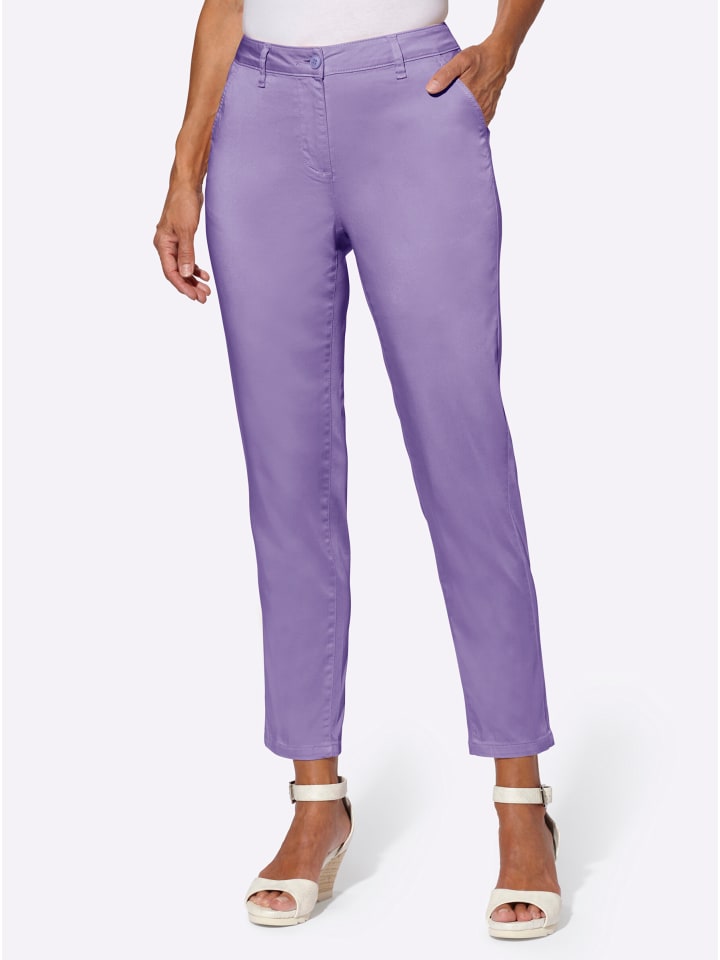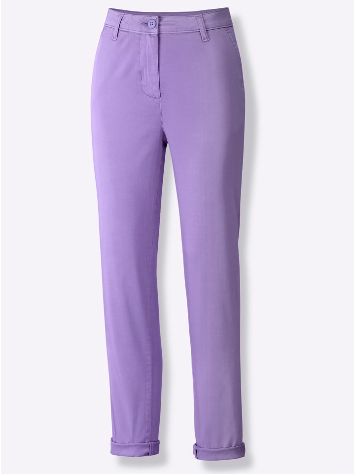 Эти брюки впечатляют своим чинос-стилем и легкой летней матовой тканью, как в расстегнутом виде, так и в закатанном. Они имеют фигурный пояс со шлевками для ремня, застежку на пуговицу и молнию спереди, два передних кармана и имитацию прорезных карманов сзади. Боковой шов, смещенный вперед, создает привлекательный силуэт. Соответствует инициативе «Хлопок, сделанный в Африке». Длина брючины около 34 см. Ремень не входит в комплект.