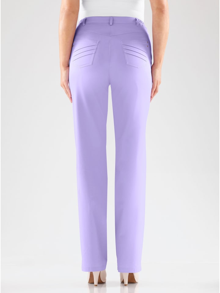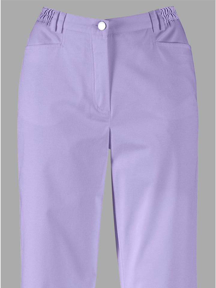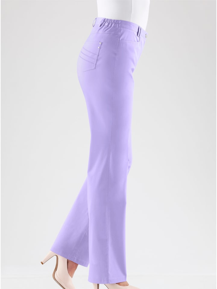 Брюки благодаря популярной нано-обработке отталкивают грязь, не мнутся, дышащие и простые в уходе. Шлевки для ремня и эластичный пояс по бокам. Два передних кармана и задние карманы украшены складками и заклепками. Длина брючины примерно 44 см. Ремень в комплект не входит.